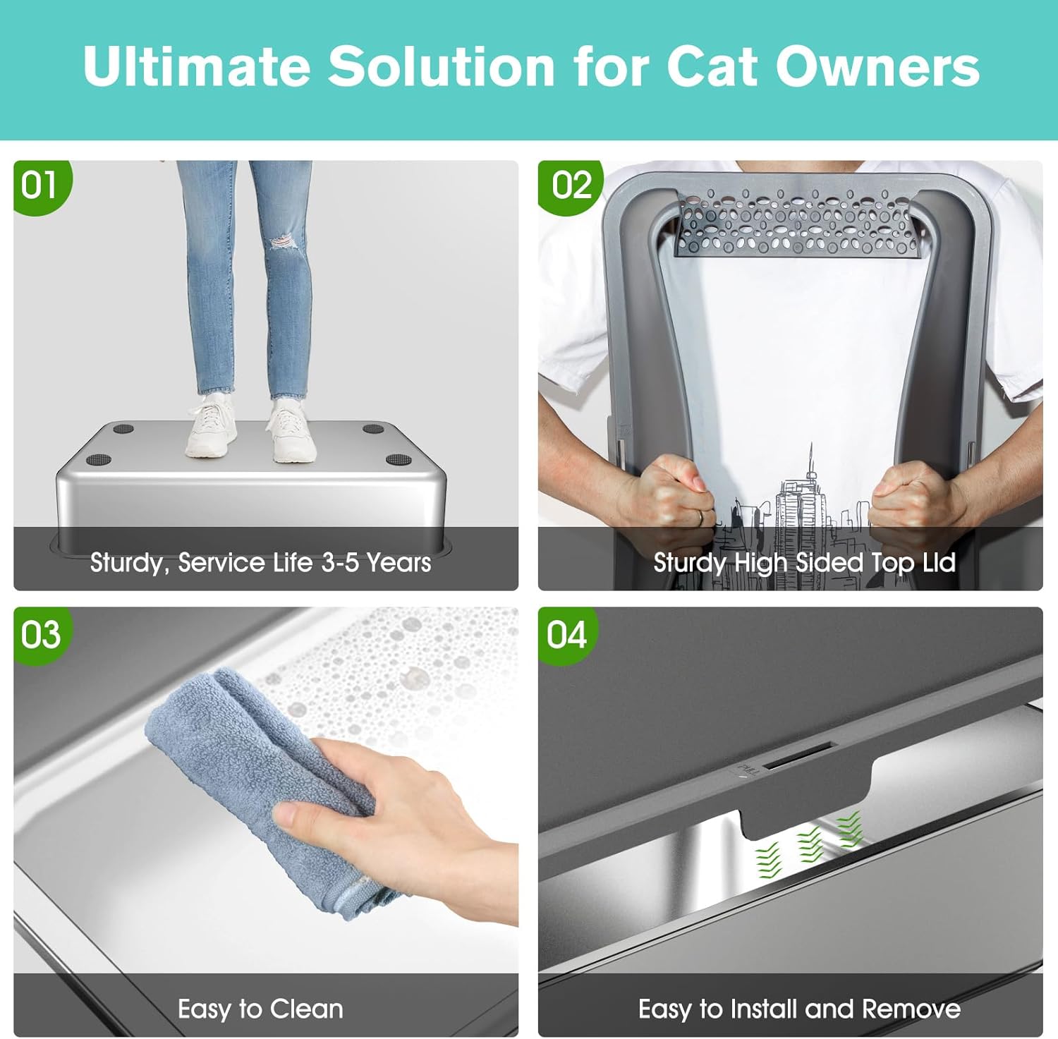- ăNon Sticky, Odor Free Steel Cat Litter Boxă: Unlike plastic alternatives, the stainless steel material does not absorb stains or odors.Its smooth, non-sticky bottom makes it very easy to clean, and these make it easy for you to maintain a fresh and clean environment for your beloved cat kitty. This feature alone makes it a standout choice for cat owner who prioritize cleanliness like you.
