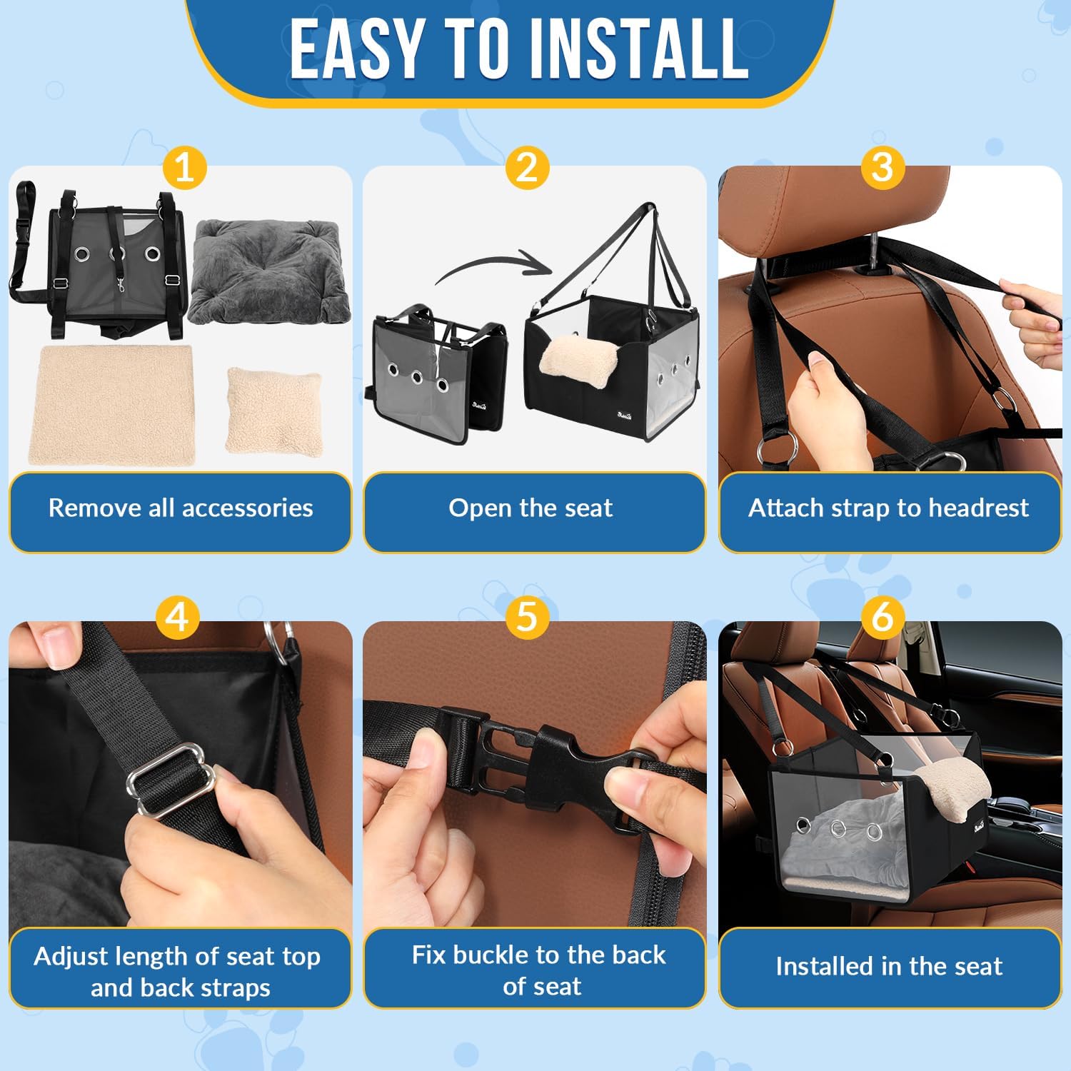- Keep Your Pets Safe --- Our dog car booster seats for puppies have 2 straps for the headrest and one strap for the back of the seat to keep the seat stable. At the same time, there is an adjustable safety rope inside the seat, which can be clipped from the inside of the booster seat to their collar. This ensures that your beloved puppies stay put during your trips, giving you peace of mind while keeping your dogs safe.
