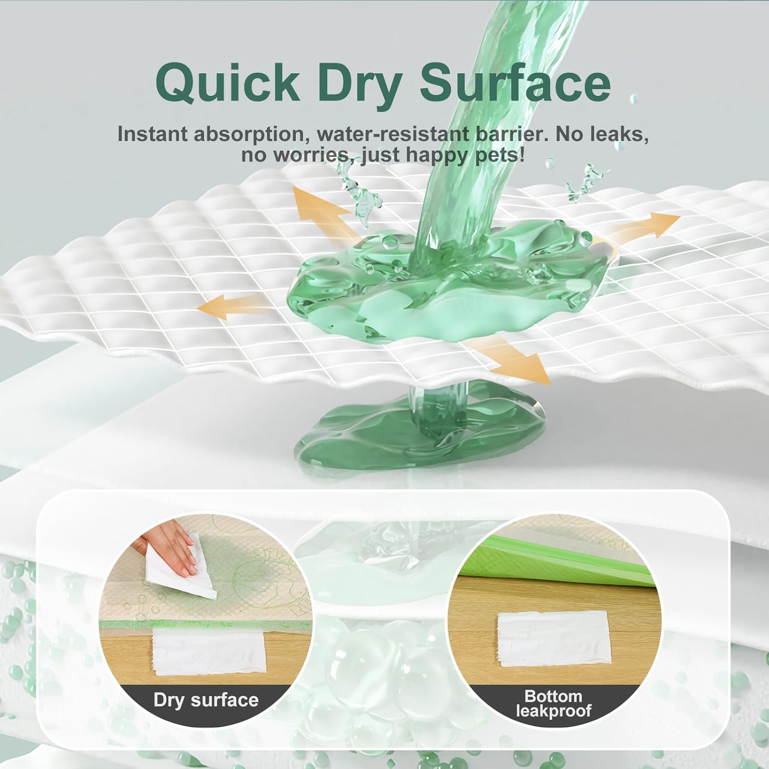 - 【Rapid Absorption】Grid design for diversion function, which help to expand the absorption area, ensuring faster urine penetration. With an impressive 1000ml capacity and ultra-fast absorption rate, our pee pads excel in maintaining dryness, keeping your pet comfortable and free from wetness on its belly, legs, or paws.