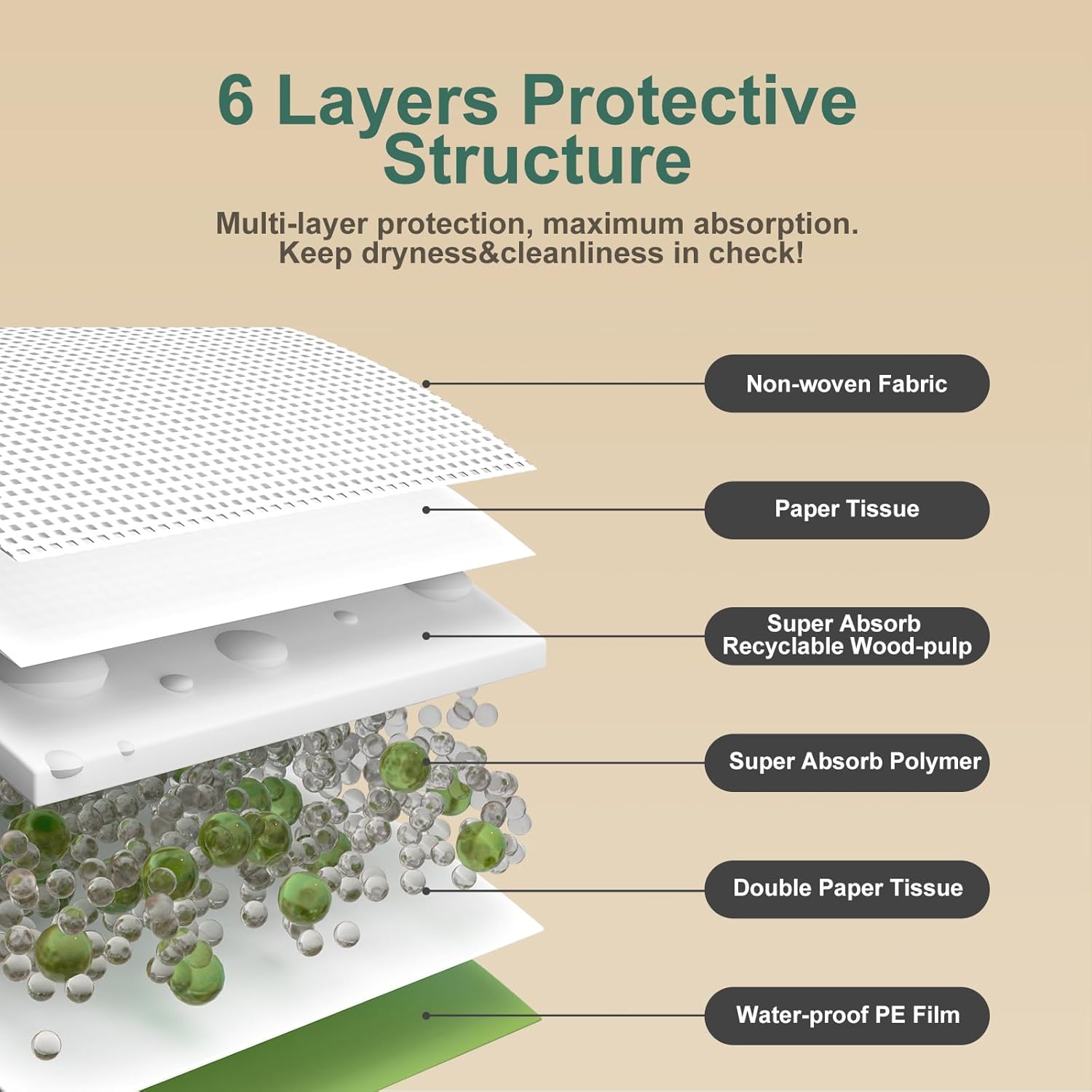 - 【Leakage Protection】Our disposable pet training pads feature a 6-layer absorbent design, enhanced with high-polymer materials that quickly absorb urine, preventing odor spread. The PE bottom film provides exceptional leak-proofing, ensuring that urine doesn't seep through to floors or carpets, which will preserve the cleanliness of your home environment.