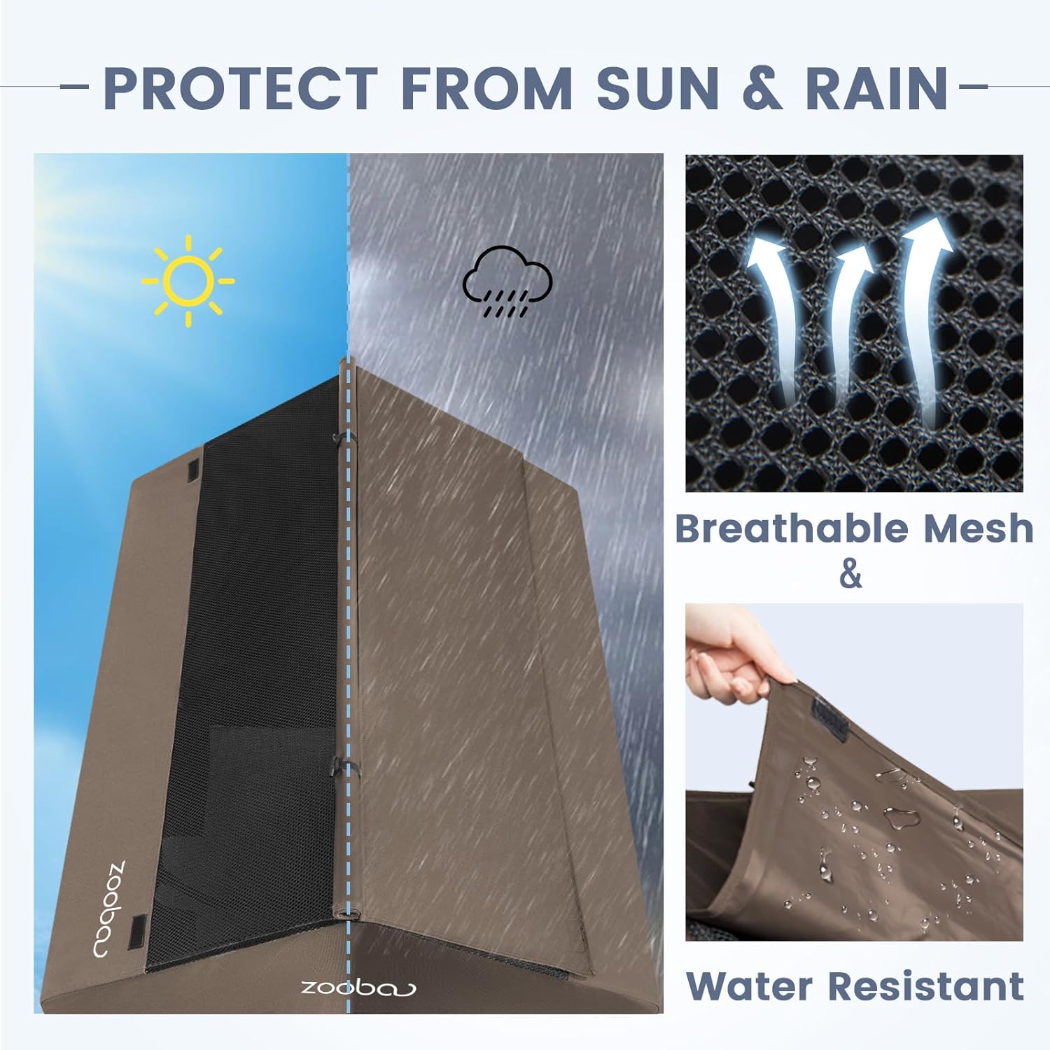 - Adaptable for Any Dog, Anywhere: Rain or shine, the Zooba elevated dog house excels in all settings. Weatherproof and secure, it's the perfect retreat for dogs of any size. Whether housing a pair of small dogs or providing a spacious playground for an extra-large canine, this versatile kennel adapts to your pet's needs, making it the ideal outdoor or indoor sanctuary.