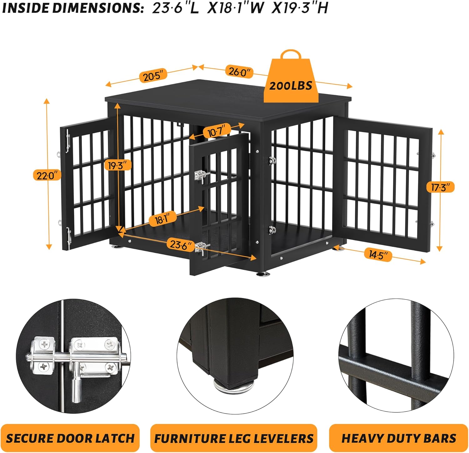 - 【Assemble with Ease】 Inside Dimensions: 23.6"L x 18.1"W x 19.3"H, Overall Dimensions: 26.0"L x 20.5"W x 22.0"H. Choosing the right crate size is vital to ensure your dog’s safety and comfort.