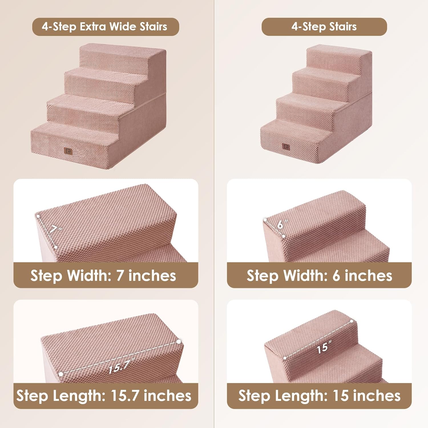 - MULTIPLE STEP SIZES - This dog stair comes in 3, 4, and 5-step options. Our 3-step pet stair is ideal for sofas and low beds (up to 18 inches high), while the 5-step version is better suited for higher beds (up to 27 inches). If your bed is of medium height (up to 23 inches), please select the 4-step one.