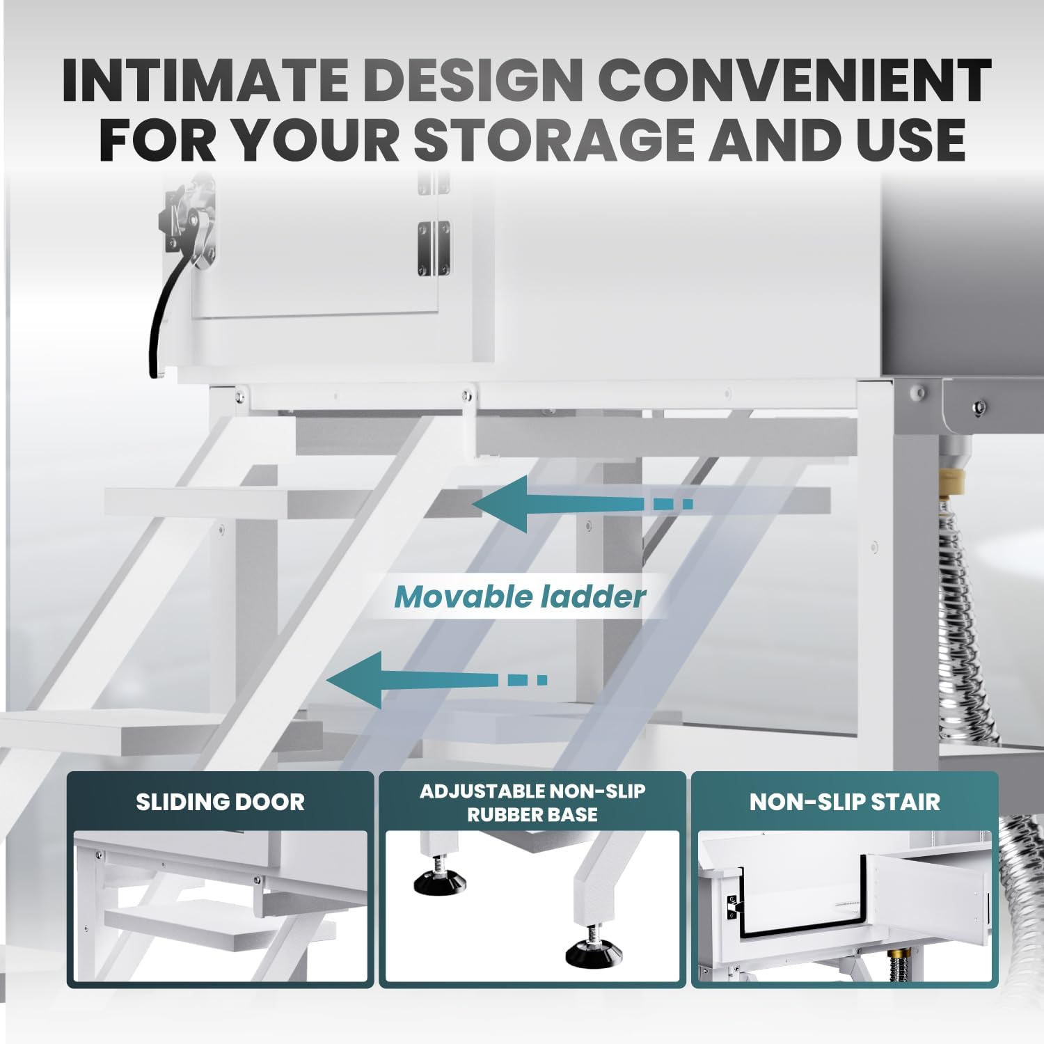 - No Need to Bend Over:Our dog bathing station provides a convenient height, eliminating the need to bend over to work. The pet bathtub can withstand up to 220 pounds, and the removable door and non-slip stairs make it easy for pets to get in and out of the bathtub. In addition, the stairs can slide inward to save space. Experience the comfort and convenience brought by our dog bathtub