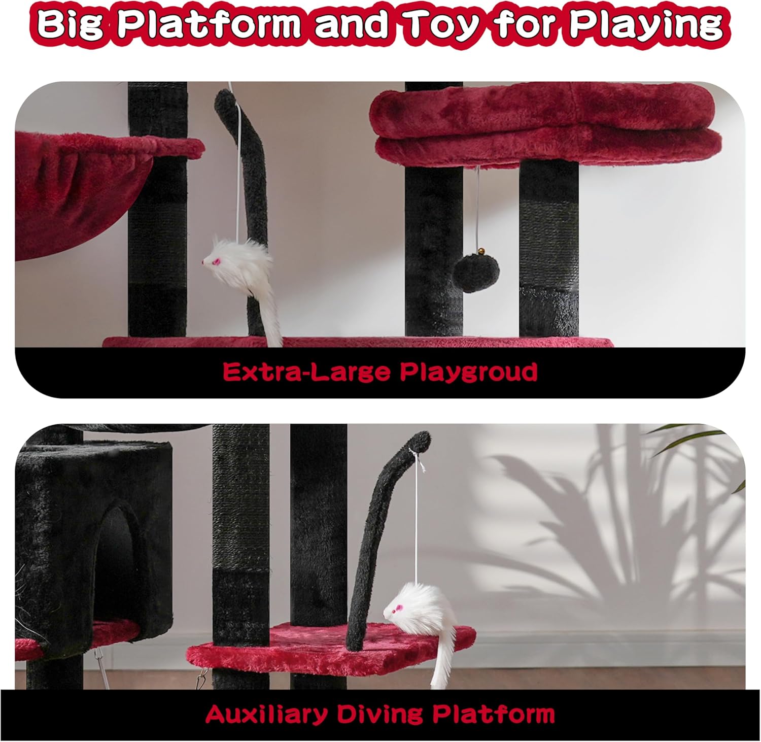 - Unleash nature:Hiding in the cat condo, scratching with sisal posts and rope, climbing via auxiliary platforms, playing with toy ball and cat teaser, Swinging in hammock, kitties can have much fun on this cat tree tower!