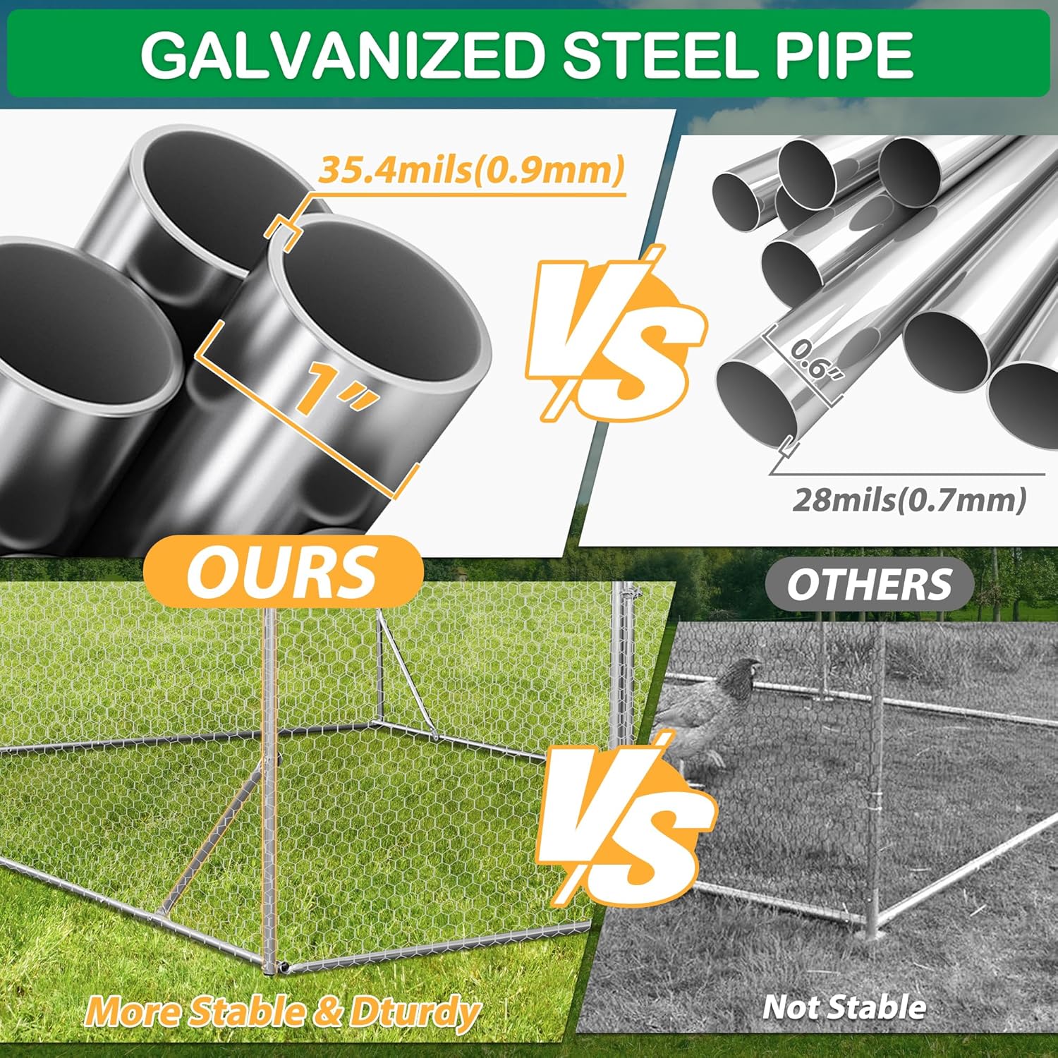 - 🐤STURDY& DURABLE: Our chicken coop is made of upgraded reinforced galvanized steel pipes with a thickness of 0.9 mm, which are strong, more durable and long-lasting than others(0.7 mm thick) .In addition, there are reinforced triangular support bars at the corners to enhance the stability of the chicken run.