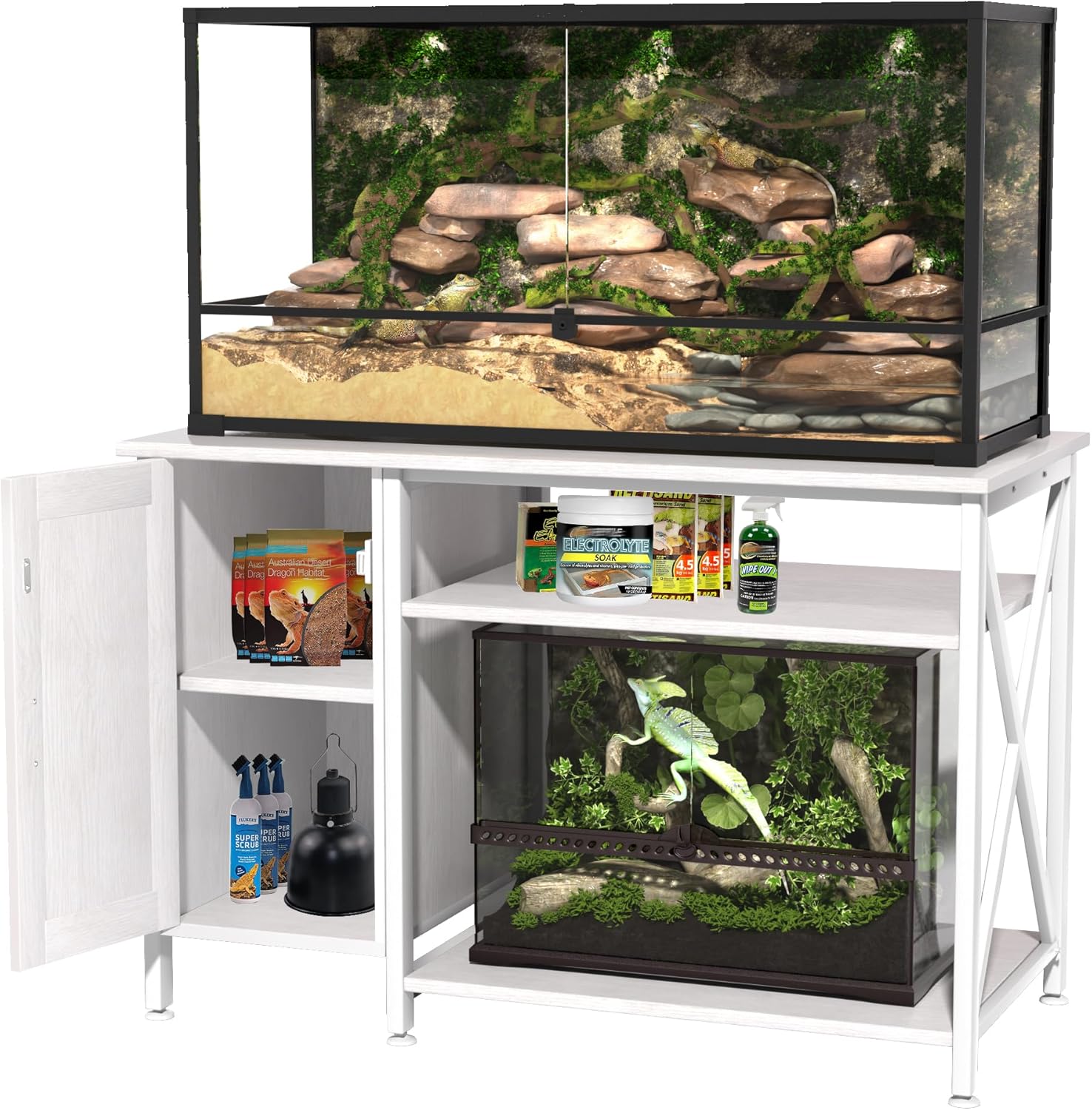 - Optimized Space Utilization - This terrarium stand offers a comprehensive solution for reptile owners. The left cabinet and upper shelf provide ample storage for reptile accessories, health supplies, habitat decor, and lighting equipment. The right-side 30" x 20" space accommodates a smaller reptile tank, creating a multi-tier habitat layout. Itβs a perfect match for a 120-gallon reptile tank stand, ensuring a more efficient and organized setup.
