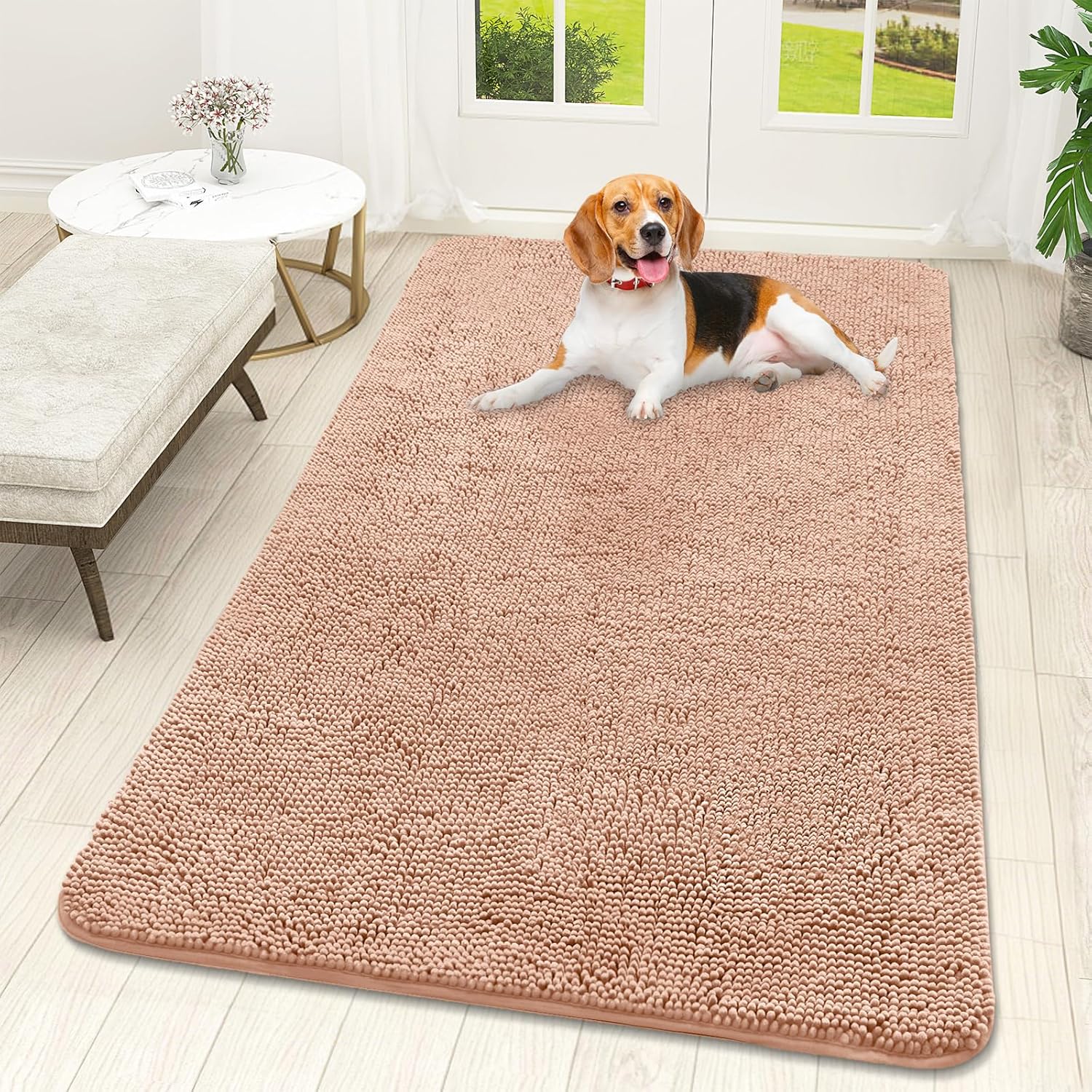 OLANLY Dog Door Mat for Muddy Paws 59x32, Absorbs Moisture and Dirt, Absorbent Non-Slip Washable Doormat, Quick Dry Chenille Mud Mat for Dogs, Entry Indoor Entryway Carpet for Inside Floor, Peach