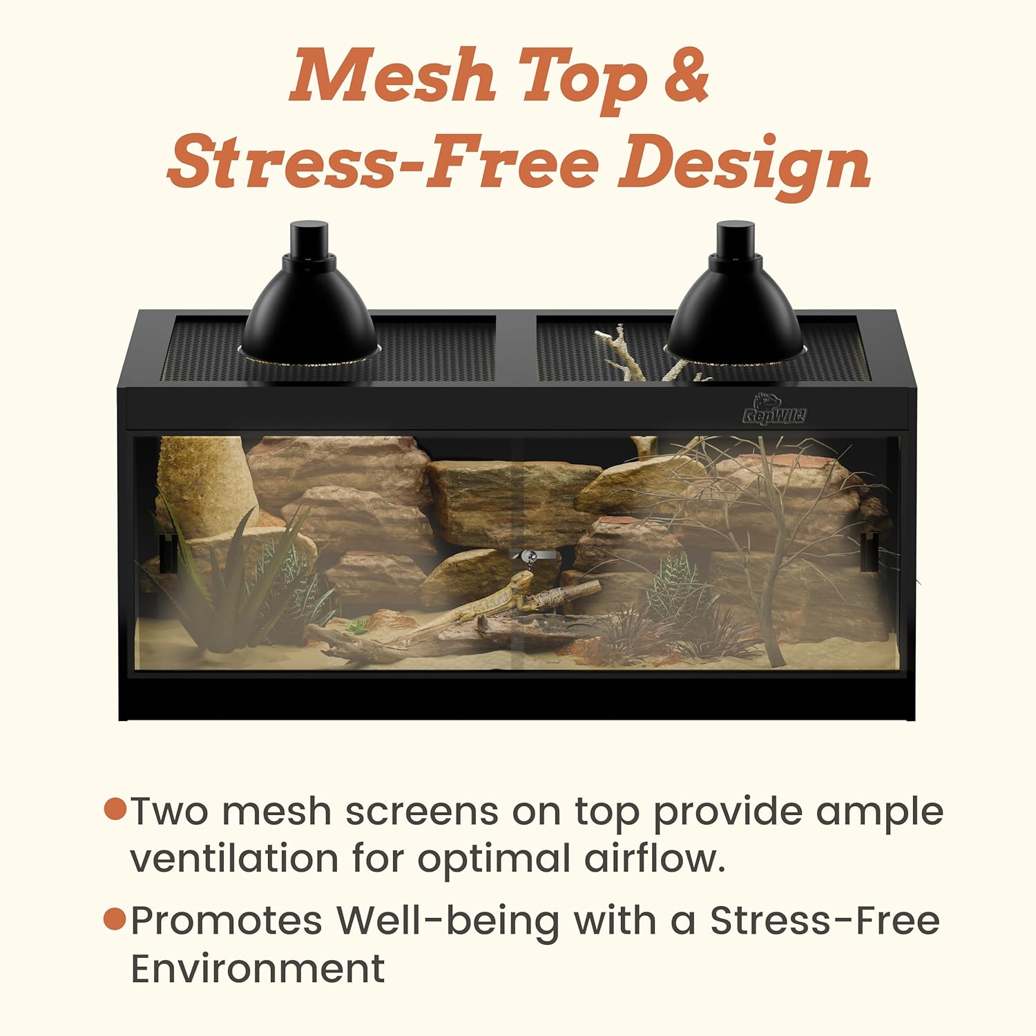 - 【Secure Glass Door & Ventilated Top】Features a front-opening tempered glass door with a lock and handle for easy access and security. The durable mesh top ensures excellent ventilation and allows UVB and heat penetration, creating a comfortable habitat for your pets.
