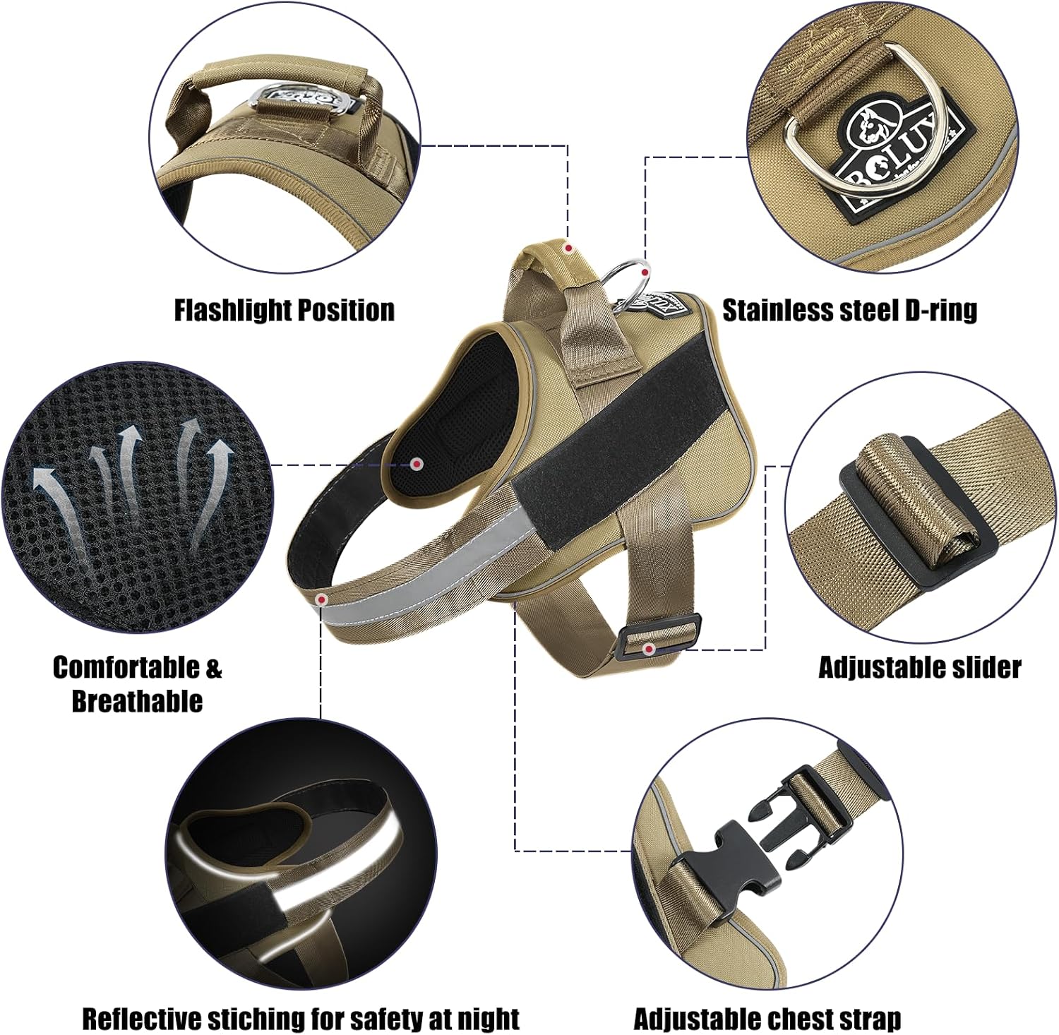 - SUPER COMFORTABLE: Bolux no choke dog harness pulling pressure is evenly distributed to the body to prevent pulling and choking. The dog vest harness have a adjustable chest strap with snap on buckle, move its body parts freely, can customized fits for your puppy growth do not need to always change it.