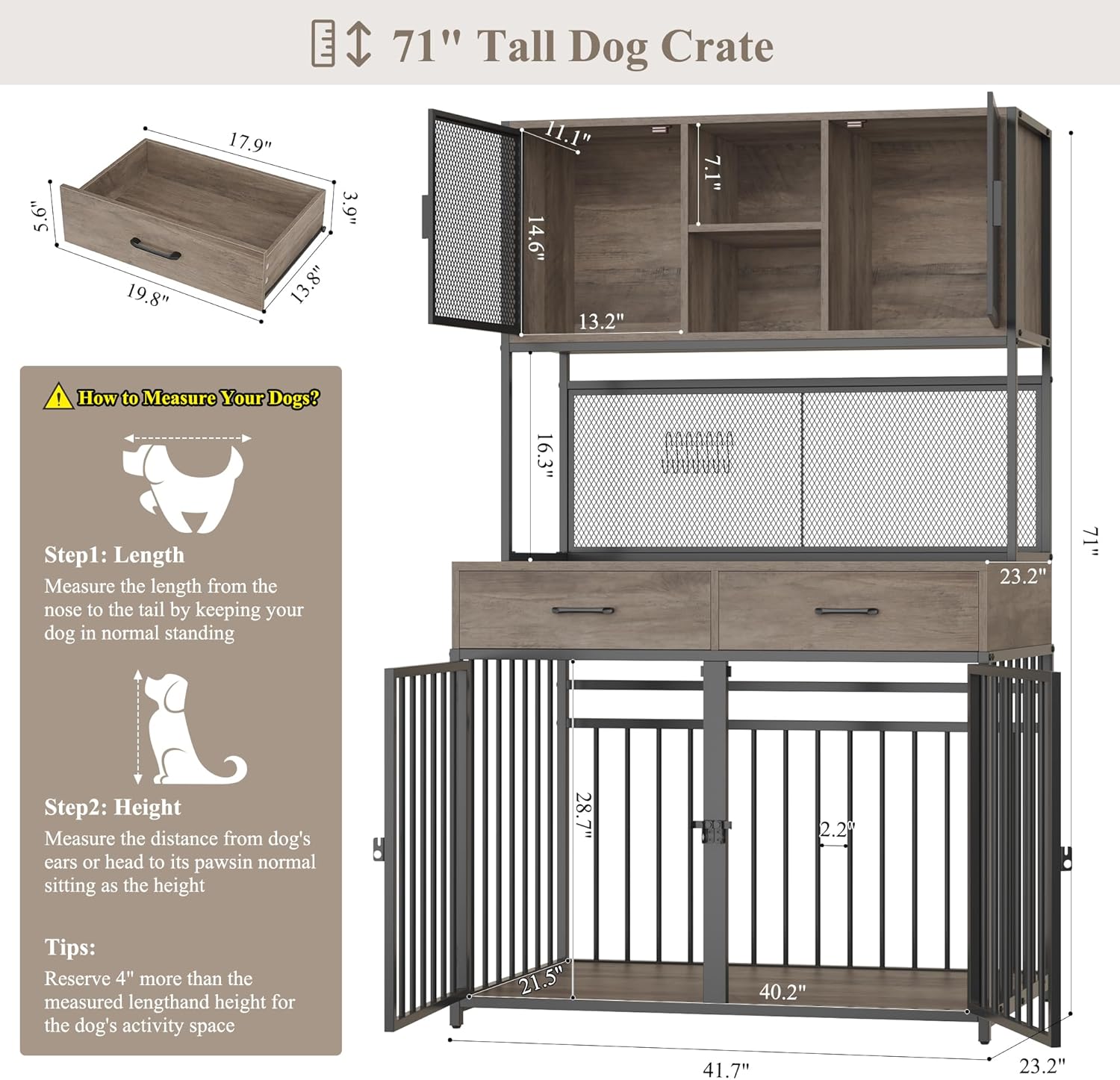 HITHOS 71" Tall Dog Crate Furniture, Indoor Dog Kennel with Hutch, 42" W Dog Cage for Large/Medium Dogs, Wood Dog Crates with 2 Storage Drawers, Heavy Duty Pet House, Ash Grey