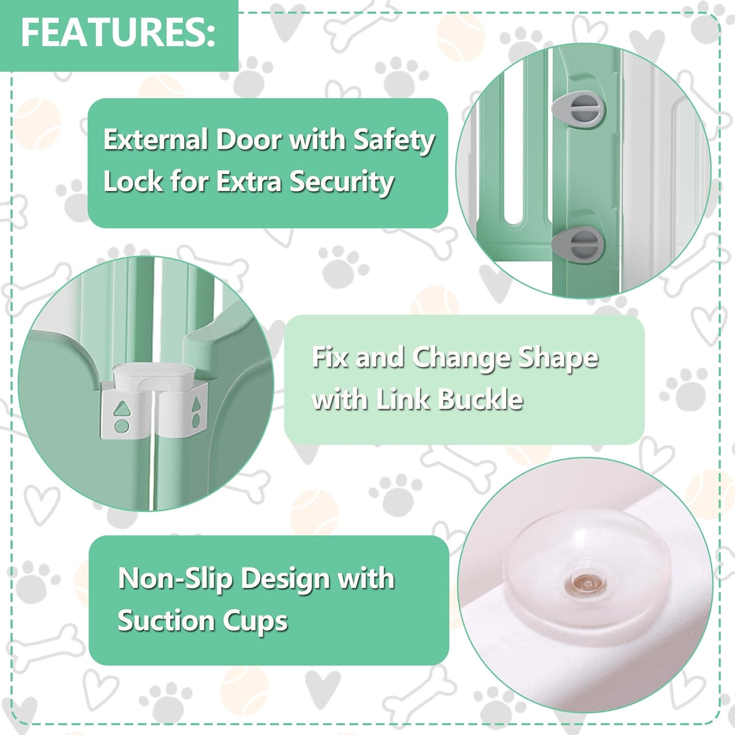- SAFETY&DURABILITY(Thickened Design): Compared with the plastic fences on the market, we are thickened fences,more resistant to bite and wear.our dog playpen indoors is made of high-quality HDPE material that is safe and sturdy.its smooth surface design prevents your dog from accidentally scratching.The external door safety lock offers secure pet containment and owner access.