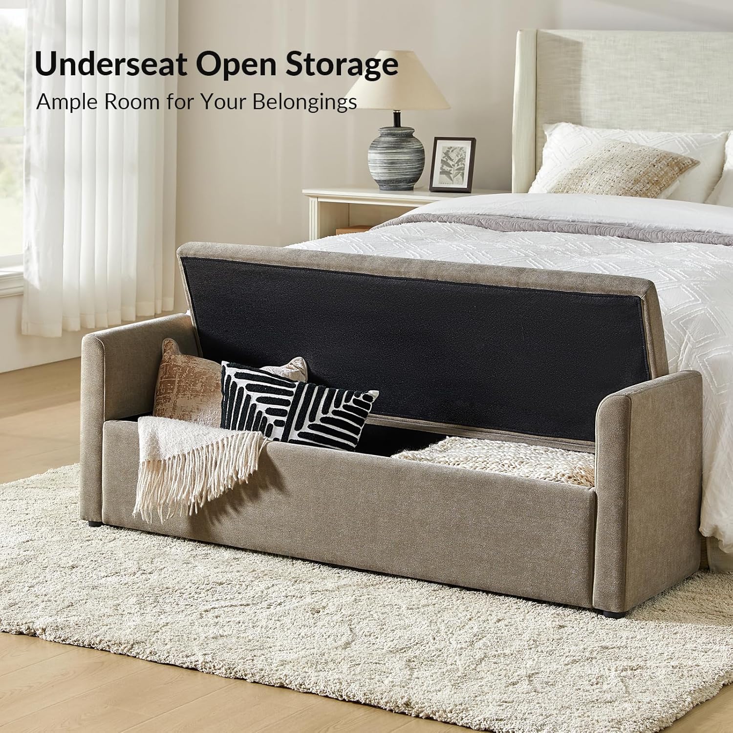 HULALA HOME Modern Storage Bench with Throw Pillows, 59.4" Extra Long Bedroom Ottoman Bench for End of Bed, Comfy Upholstered Footstool for Entryway Dining Room Living Room, Brown