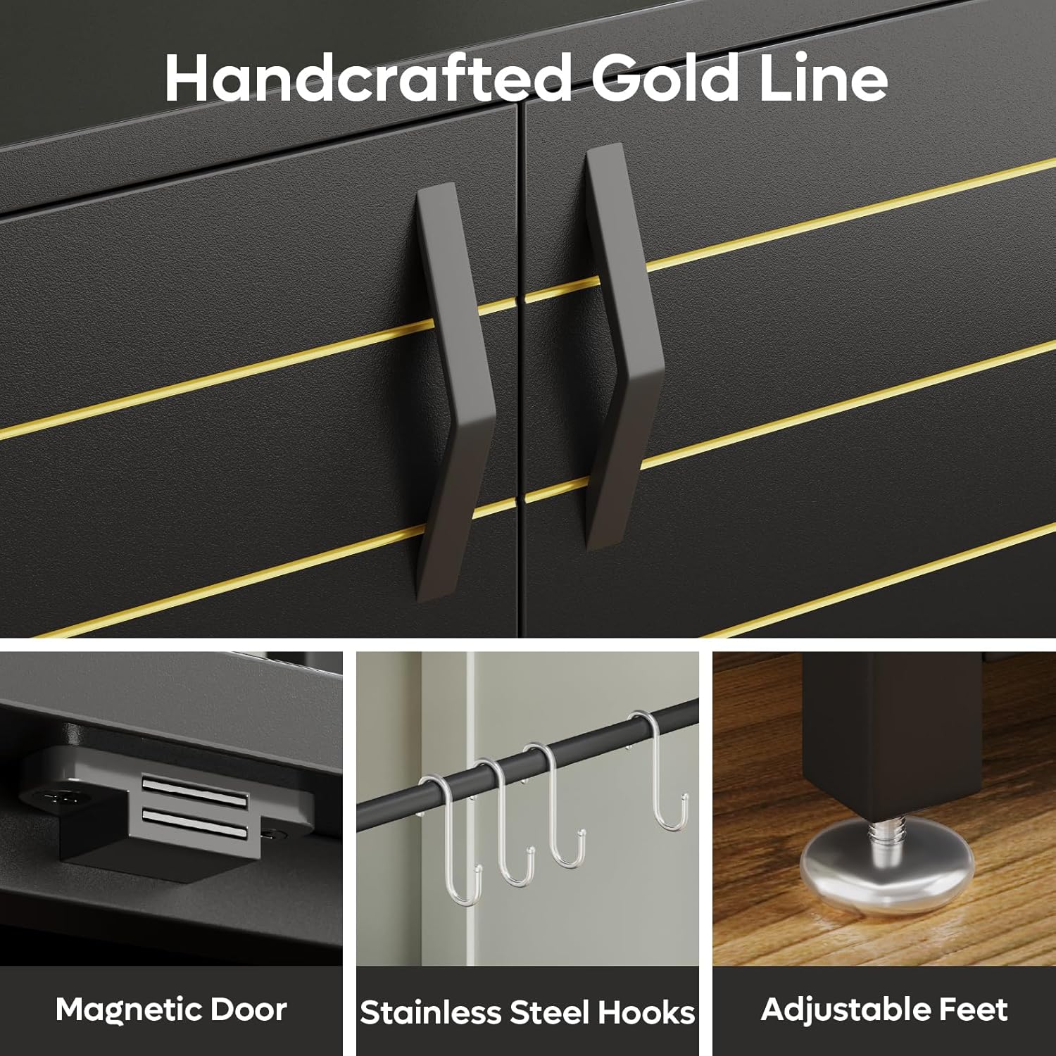 Bestier 20-29 Gallon Fish Tank Stand with Power Outlets, Metal Long Aquarium Stand with Storage Cabinet, 31x15 Reptile Terrarium Stand with Horizontal Gold Line, Stainless Hooks, 350 Lbs(Black)