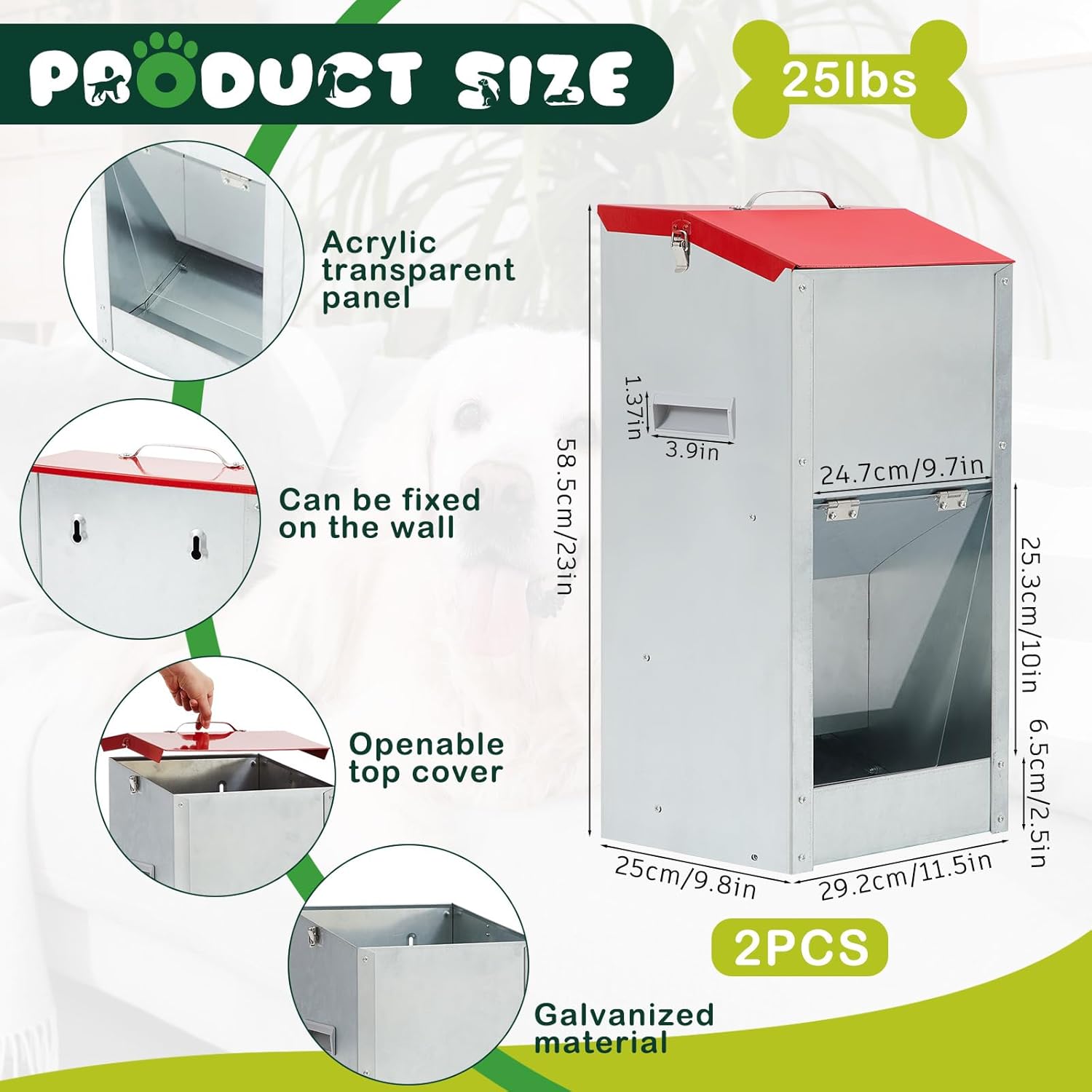 - Package: the package includes 1 piece of 25lbs galvanized automatic dog feeder, with a dimension of 11.5 x 9.8 x 23 inch/ 29.2 x 25 x 58.5 cm; And 1 automatic water dispenser for dogs proving a complete feeding solution; This takes away the hassle of making separate purchases and your pet's feeding and hydration needs are well taken care of