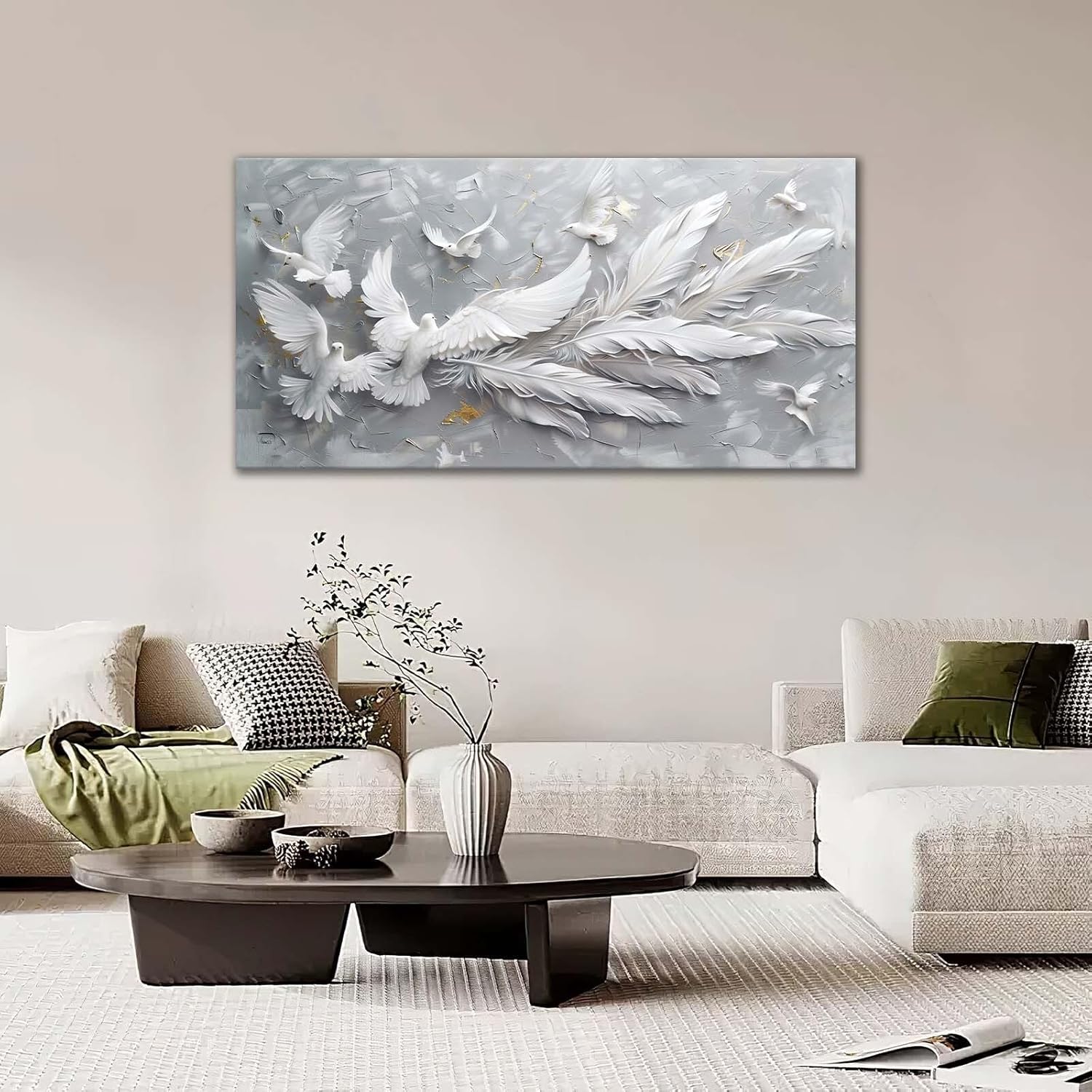 - 【Unique Design】3D abstract art painting of white doves with feathers flying in the air, against a gray background with gold accents.
