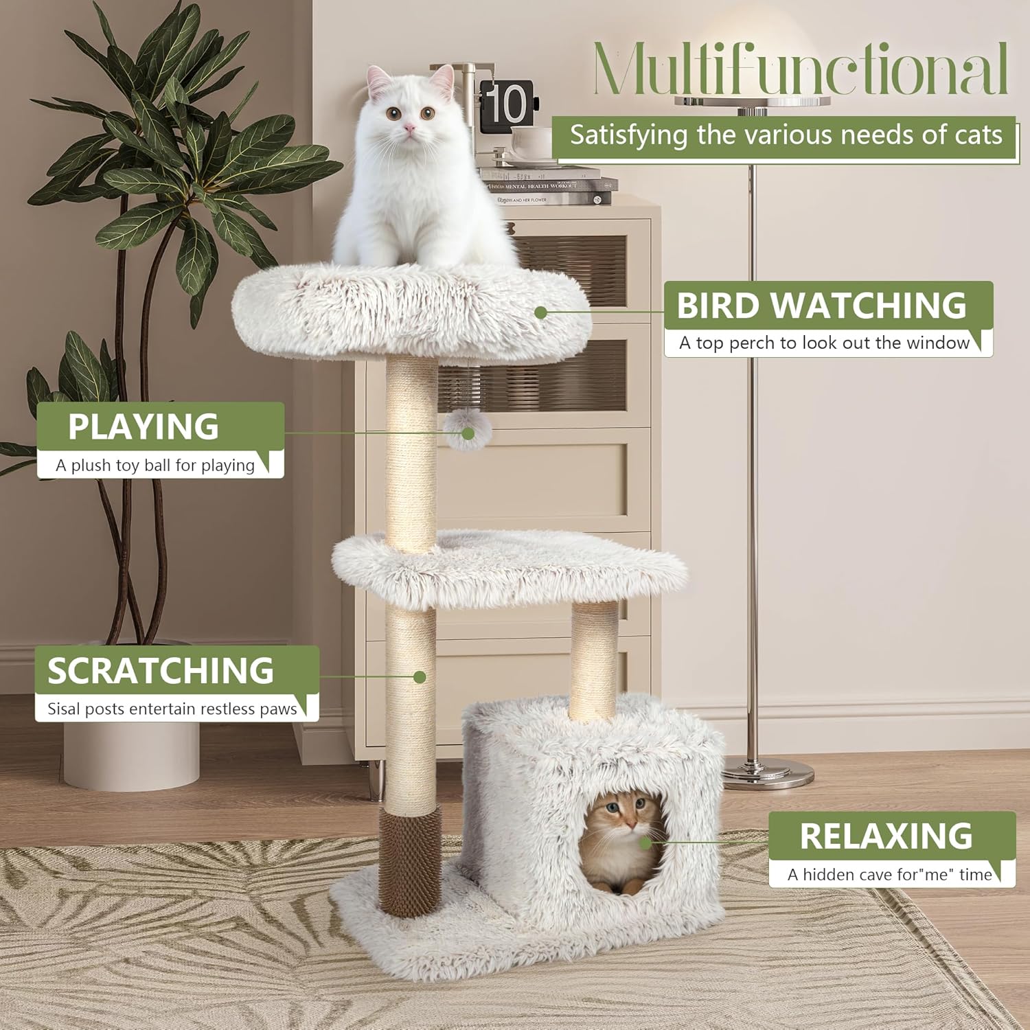 - đșăProtects Your FurnitureăSay goodbye to scratched-up sofas and beds! This cat tree is equipped with multiple scratching posts and a board to satisfy your cat's scratching needs. The fluffy little house will keep your kitty feeling cozy and secure.