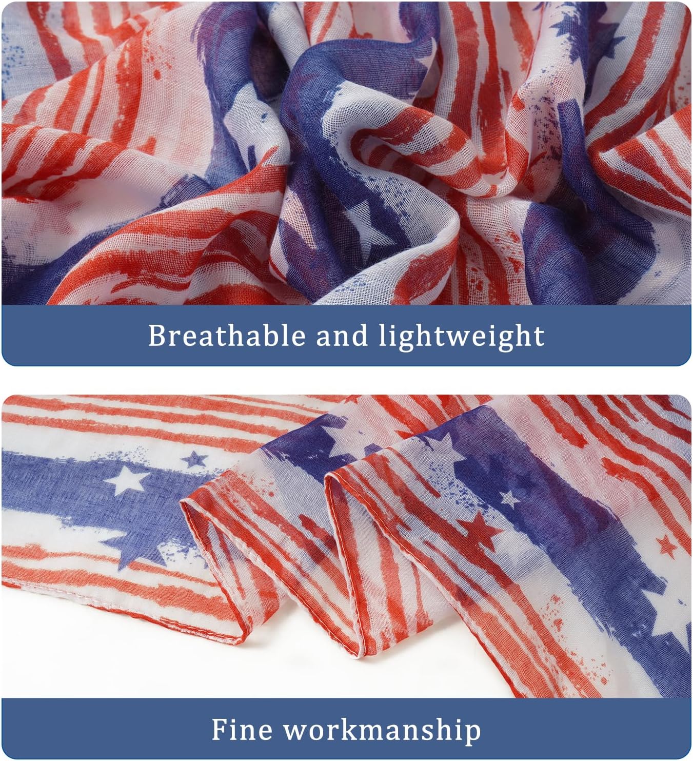 - Multipurpose:The 4th of july scarf for women can mix and match for any type of Coat,Jacket,Blouse,Sweater,Shirt and Dress. Long scarf can be hijab, knotted ,twisted,wrapped or doubled around neck, shoulders and head