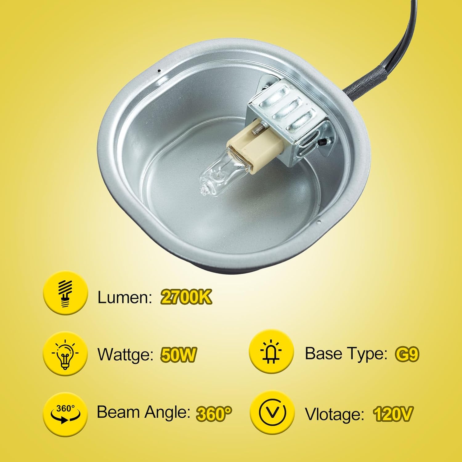 - Universal Compatibility & Warranty: This reptile heat lamp fixture works with most standard G9 bulbs MAX 50W(included 1pcs). Backed by our 90-day hassle-free replacement for defects, ensuring reliable habitat heating solutions