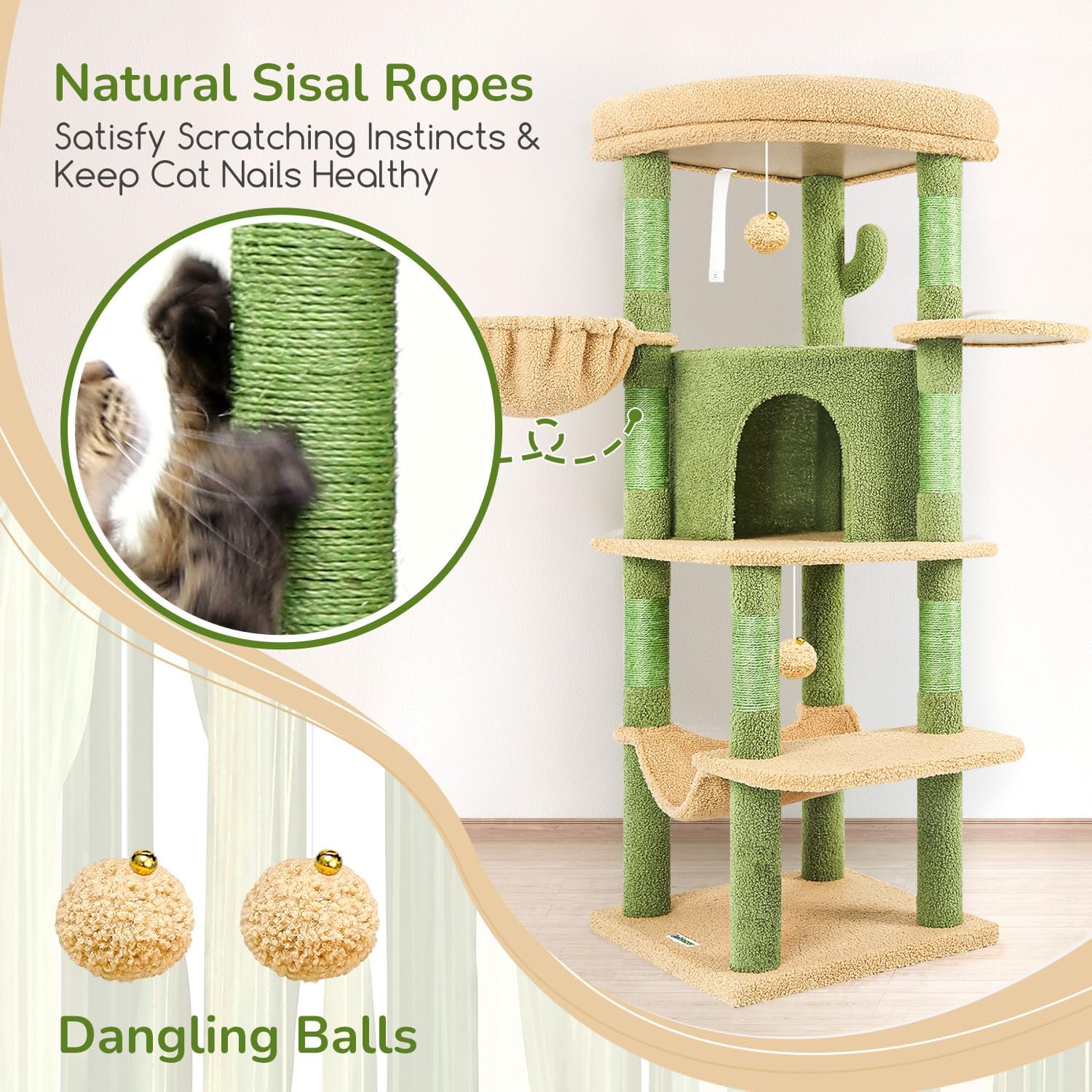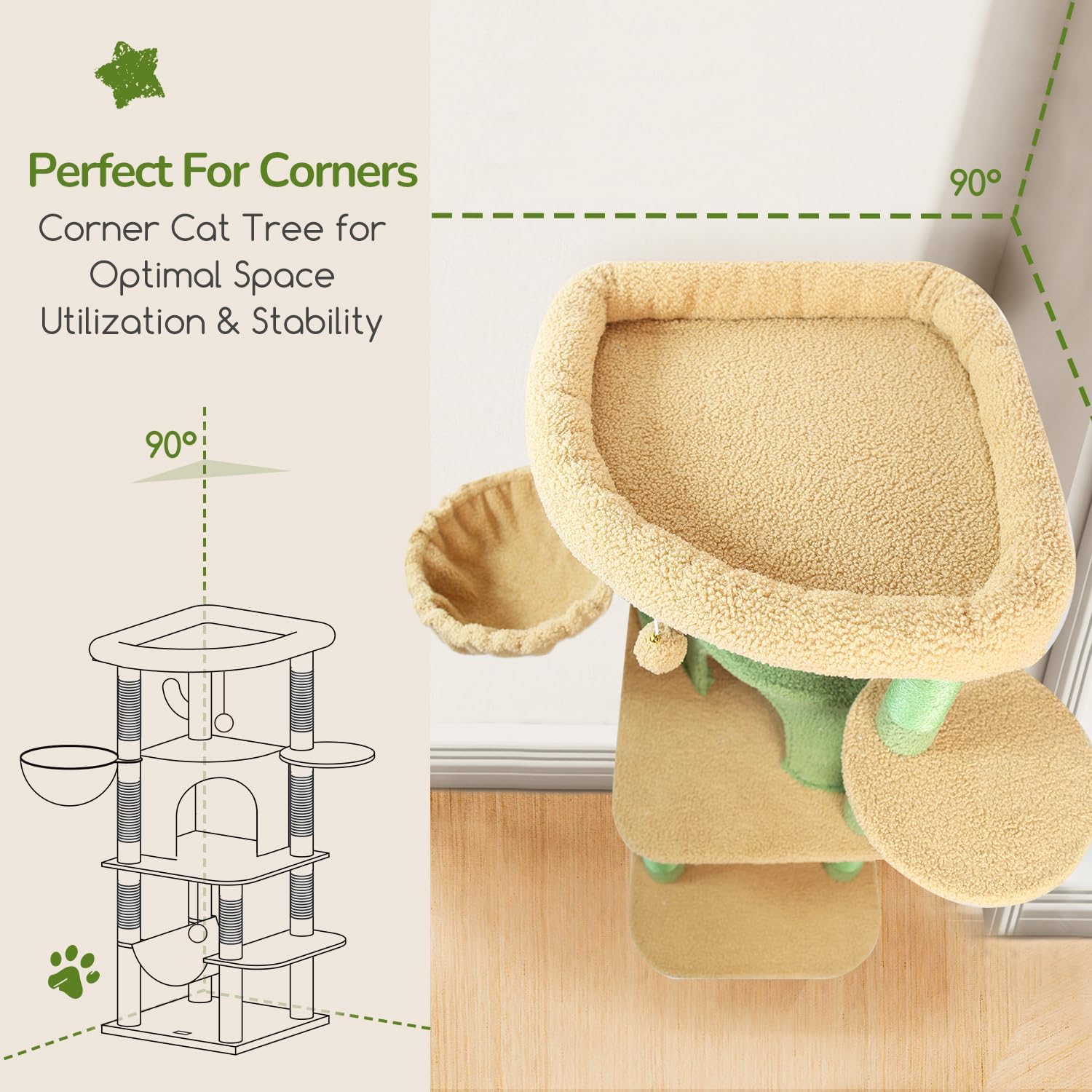 Globlazer Cactus Corner Cat Tree Tower with Scratching Post for Indoor Cats, 51in Multi-Level Cat Condo Tower with Large Hammock, Fan-Shaped Padded Perch, Spacious Cat Cave, Hanging Basket, C51, Green