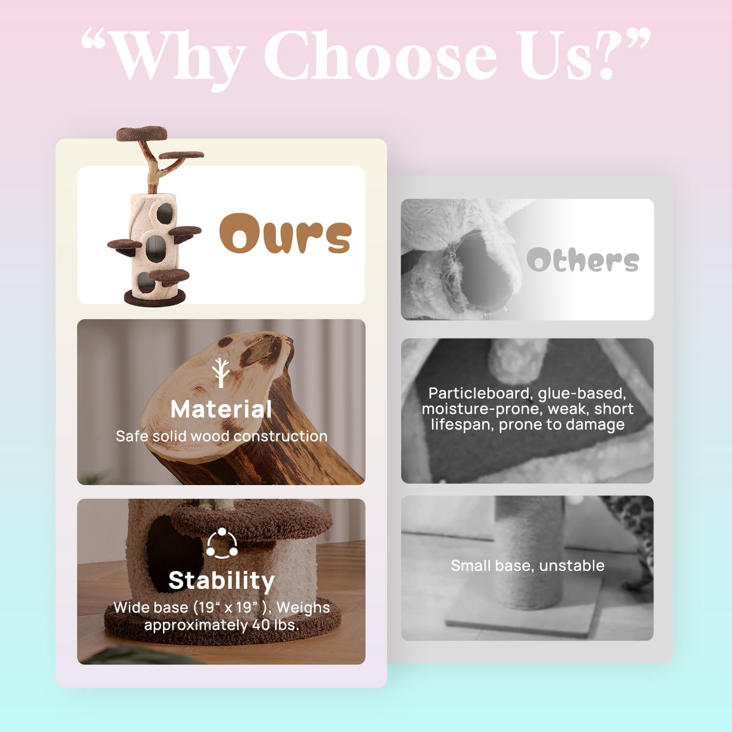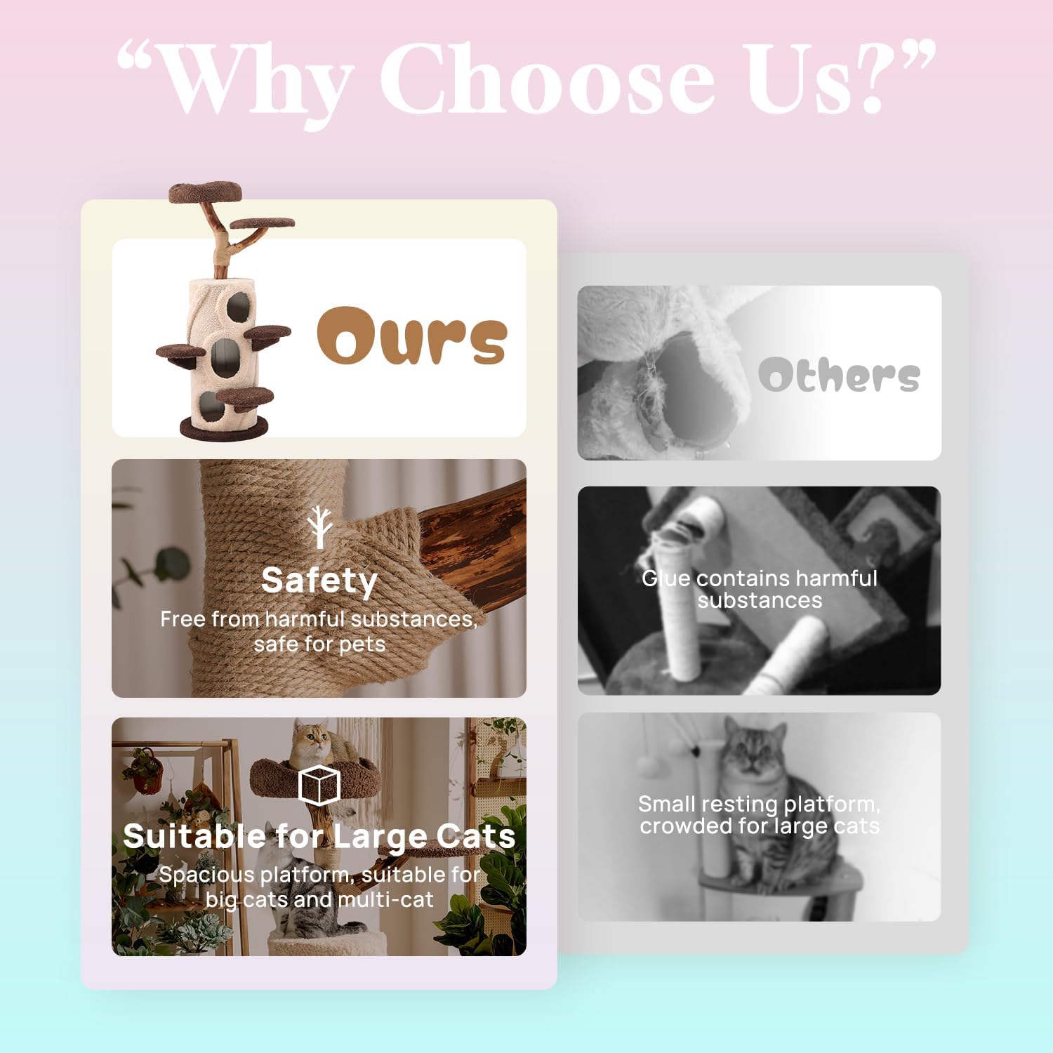 - Premium Eco-Friendly Materials: Cat tower crafted with hand-polished natural fruitwood branches (2-3" diameter) showcasing unique wood grains. Wrapped in durable natural jute rope for extended scratching use. Features an ultra-stable 40.2-lb base (1.2" thick) and E1-certified MDF boards. Compact 0.18㎡ footprint blends seamlessly into home decor.