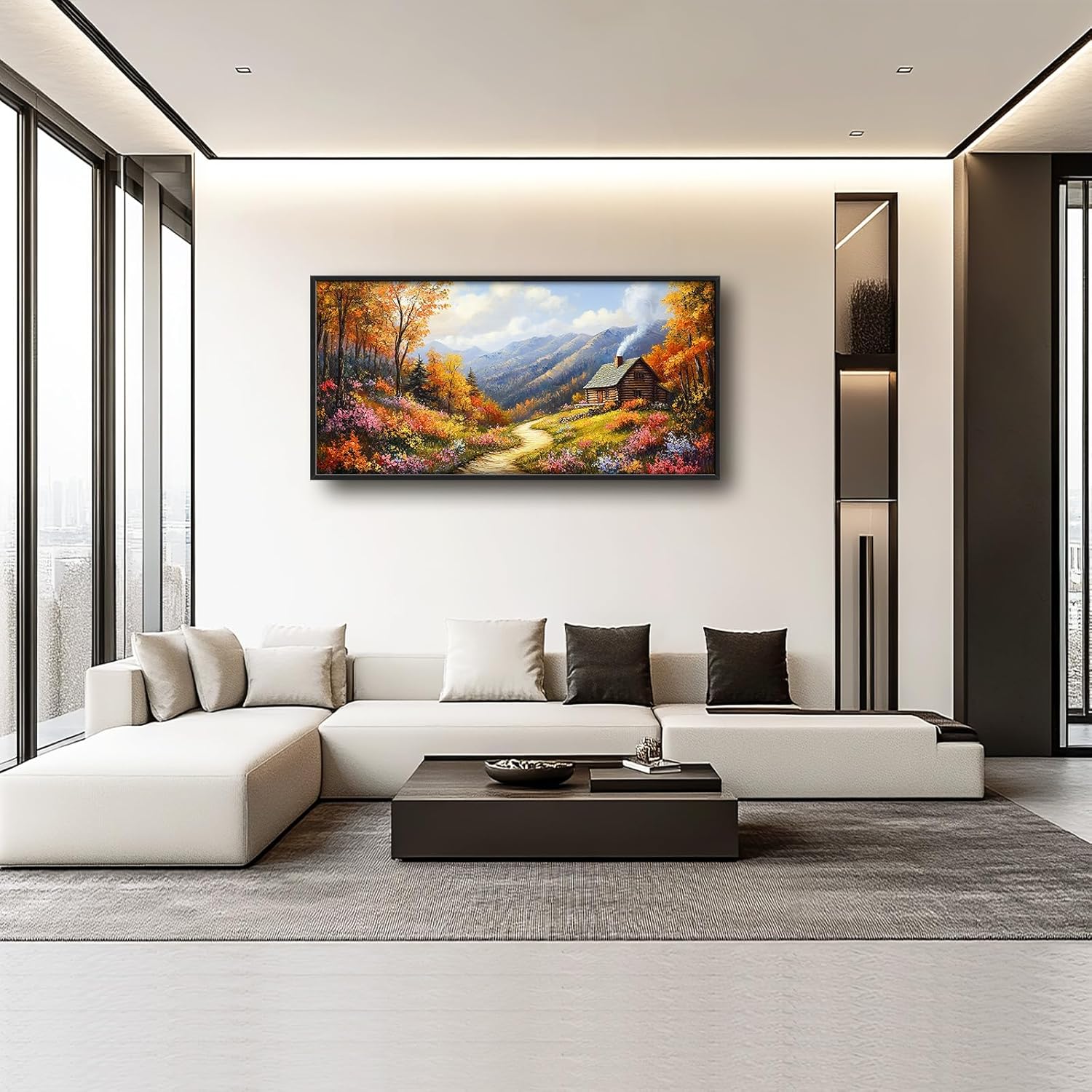 Framed Large Autumn Mountain Wall Art for Living Room, Oversized Wildflower Tree Wall Decor Nature Landscape Canvas Painting Modern Artwork Home Decoration for Living Room Bedroom 60"x30"