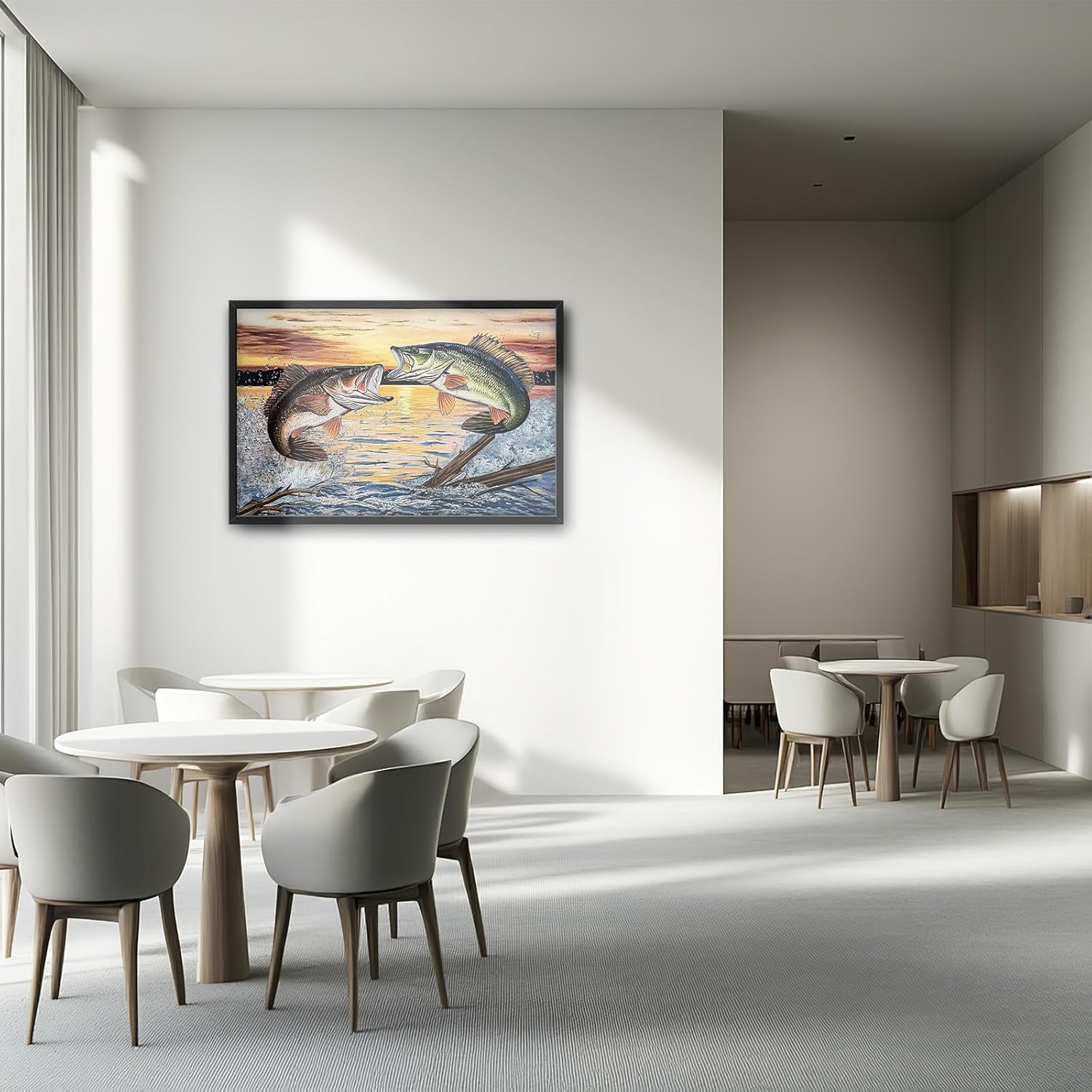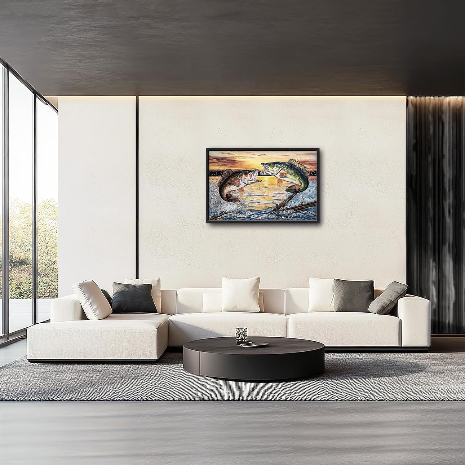 Large Fish Wall Art for Living Room, Framed Bass Fishing Wall Decor, Oversized Rustic Sunset Lake Canvas Painting Fish Pictures Modern Artwork Home Decoration for Living Room Bedroom Office 36"x24"