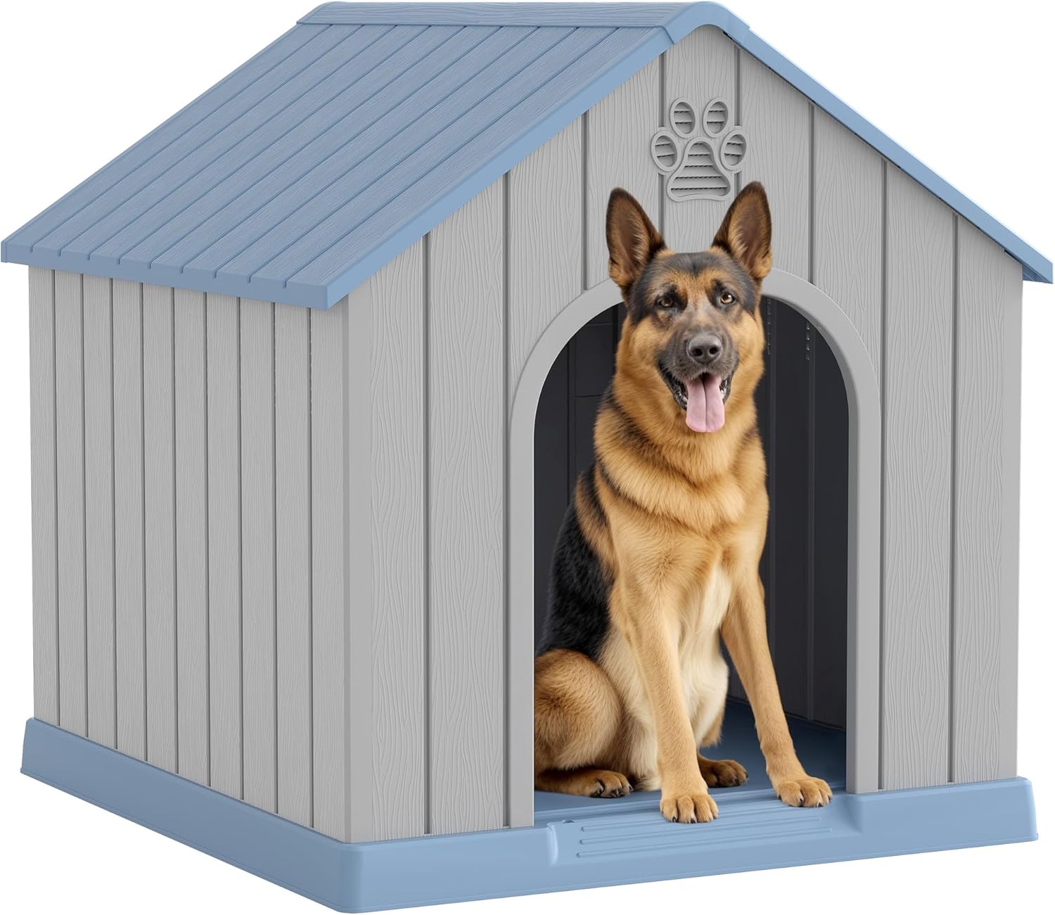 Large Dog House Outdoor Indoor for Medium Large Dogs, Durable Plastic Waterproof Doghouse with Air Vents and Elevated Floor, Easy Clean and Assemble (Blue, 36.2''L×38''W×38''H)