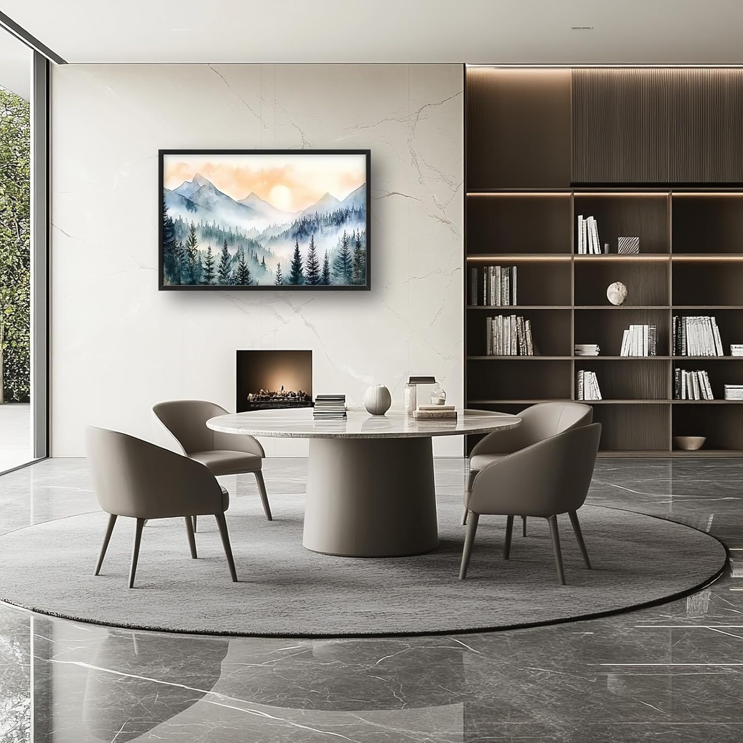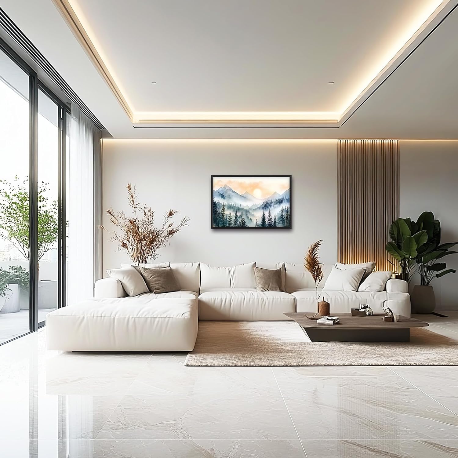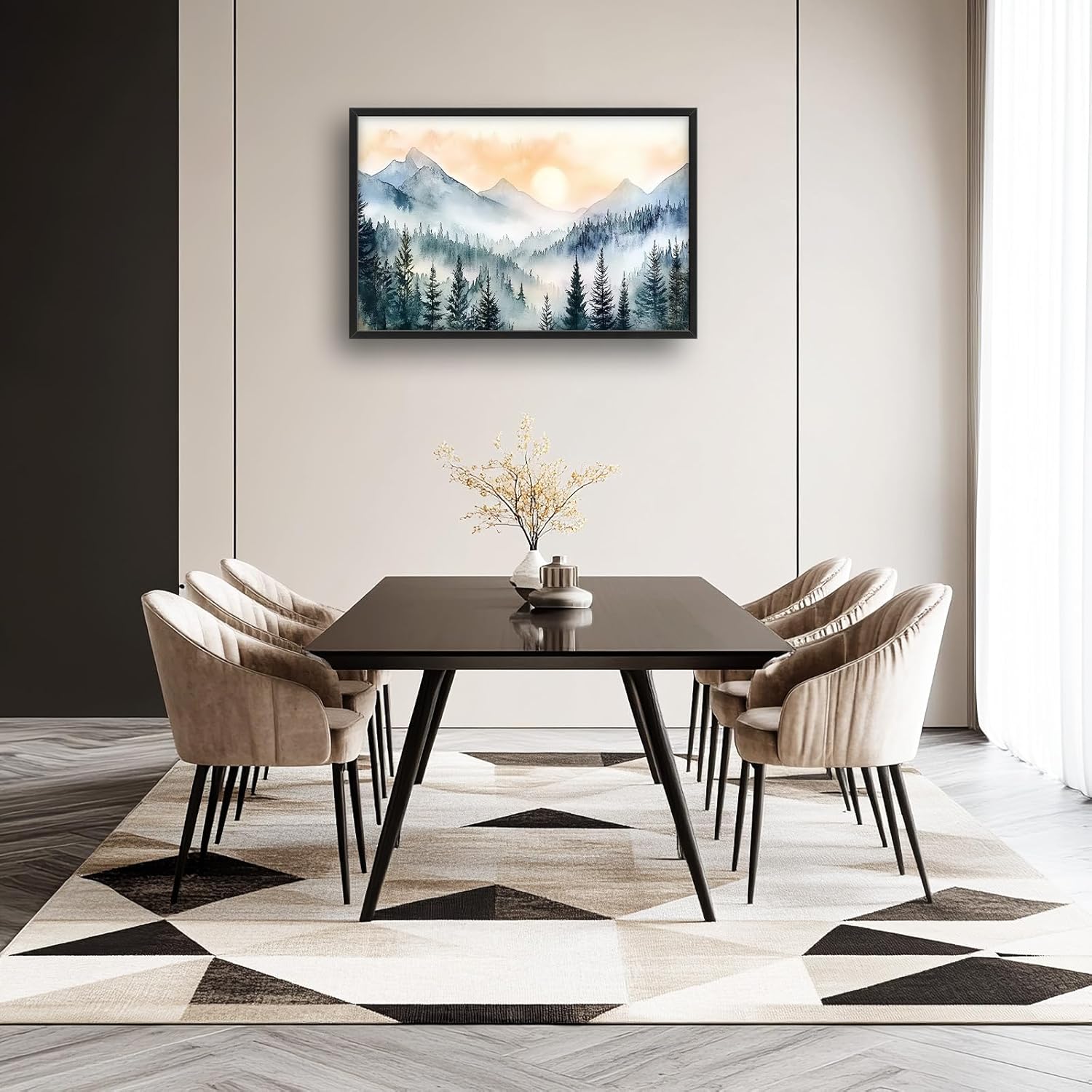 Large Misty Mountain Forest Wall Art for Living Room, Framed Foggy Sunrise Landscape Wall Decor Oversized Watercolor Canvas Painting Modern Artwork Home Decoration for Bedroom Office 36"x24"