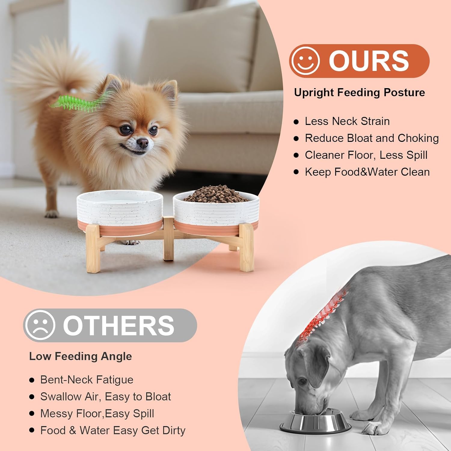 - Adjustable Bamboo Stand for Healthier Posture – Transform the set into true elevated dog bowls by choosing either of two height settings; the raised position helps dogs and cats eat in a more natural alignment, which can ease neck pressure and support smoother swallowing—ideal for pets prone to gulping, minor regurgitation, or digestive discomfort