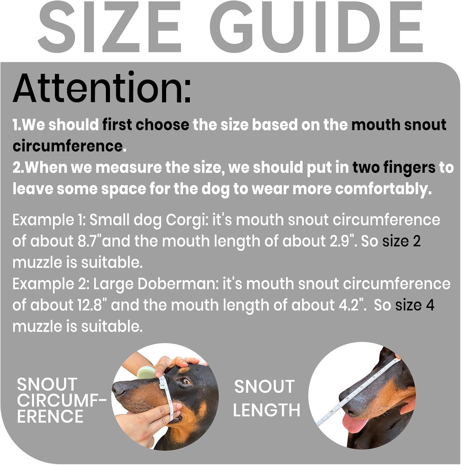 - PLEASE MEASURE BEFORE BUYING:Measure both snout circumference and snout length before purchasing. If your dog's snout length exceeds the size range by about 1 inch, choose the next size up. For long-snout breeds like Dobermans, make sure the snout length fits as well.