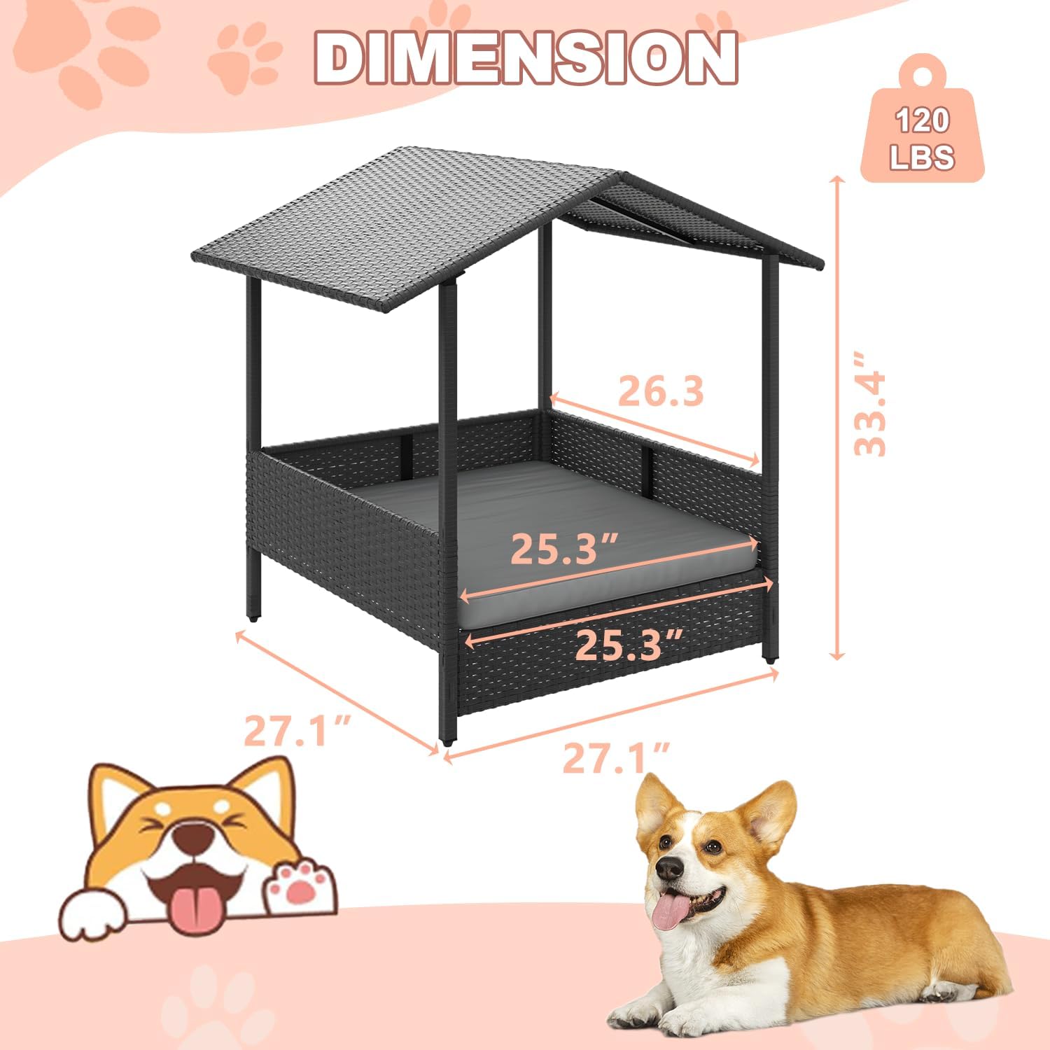 LEMBERI Outdoor Rattan Dog House with Canopy, Indoor Dog Bed for Small/Medium Dogs with Removable Cushion, Washable Cover, Dog Shelter for Patio, Deck, Yard, Pool, Black