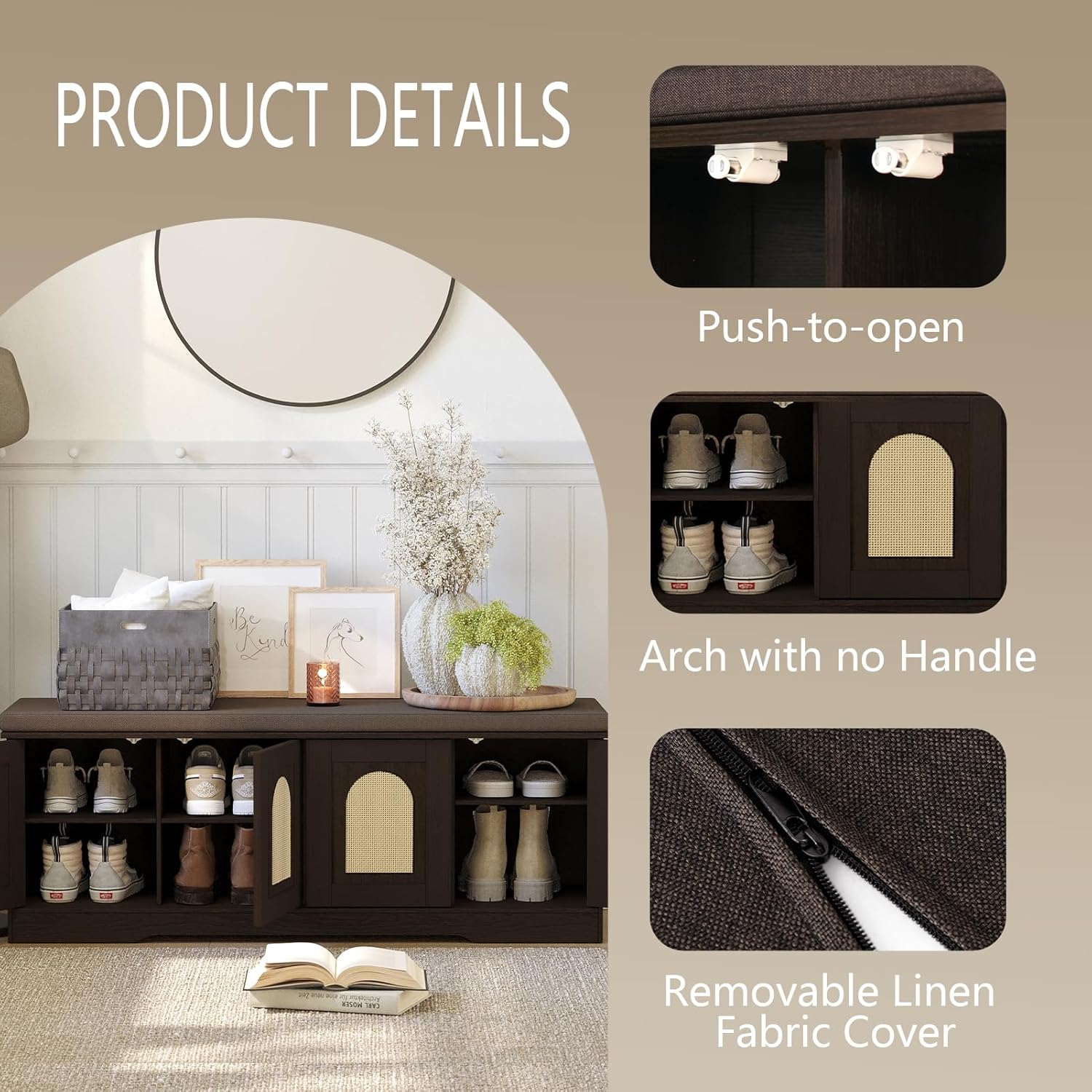 DINZI LVJ Shoe Bench, Entryway Storage Bench with Doors, Cushion, 2-Tier Shoe Rack with 8-Cubby, 47.2”L x 13.8”W Shoe Organizer Cabinet, Adjustable Shelf, Living Room, Bedroom, Espresso with Rattan