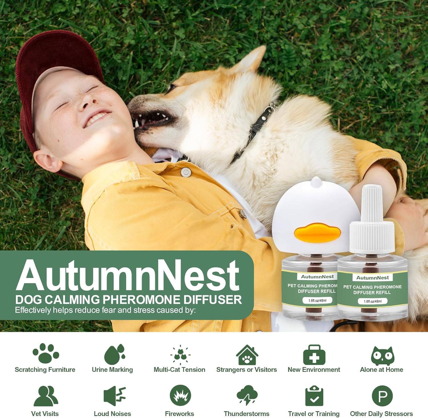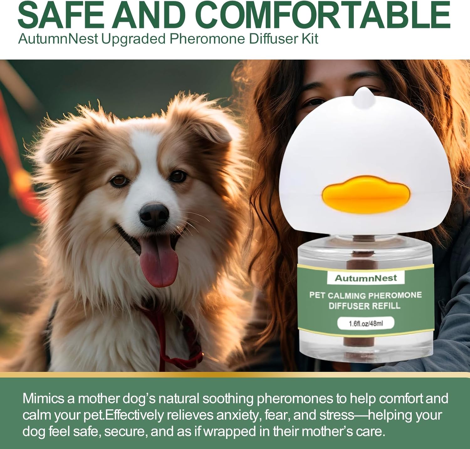 - 【Helps Calm Within 14 Days – Natural, Gentle Formula】 Using safe synthetic pheromones inspired by mother-dog signals, AutumnNest helps soothe your dog within 1–2 weeks. Perfect for separation anxiety, fireworks, thunderstorms, travel, or visits to the vet, this diffuser offers gentle and consistent comfort.