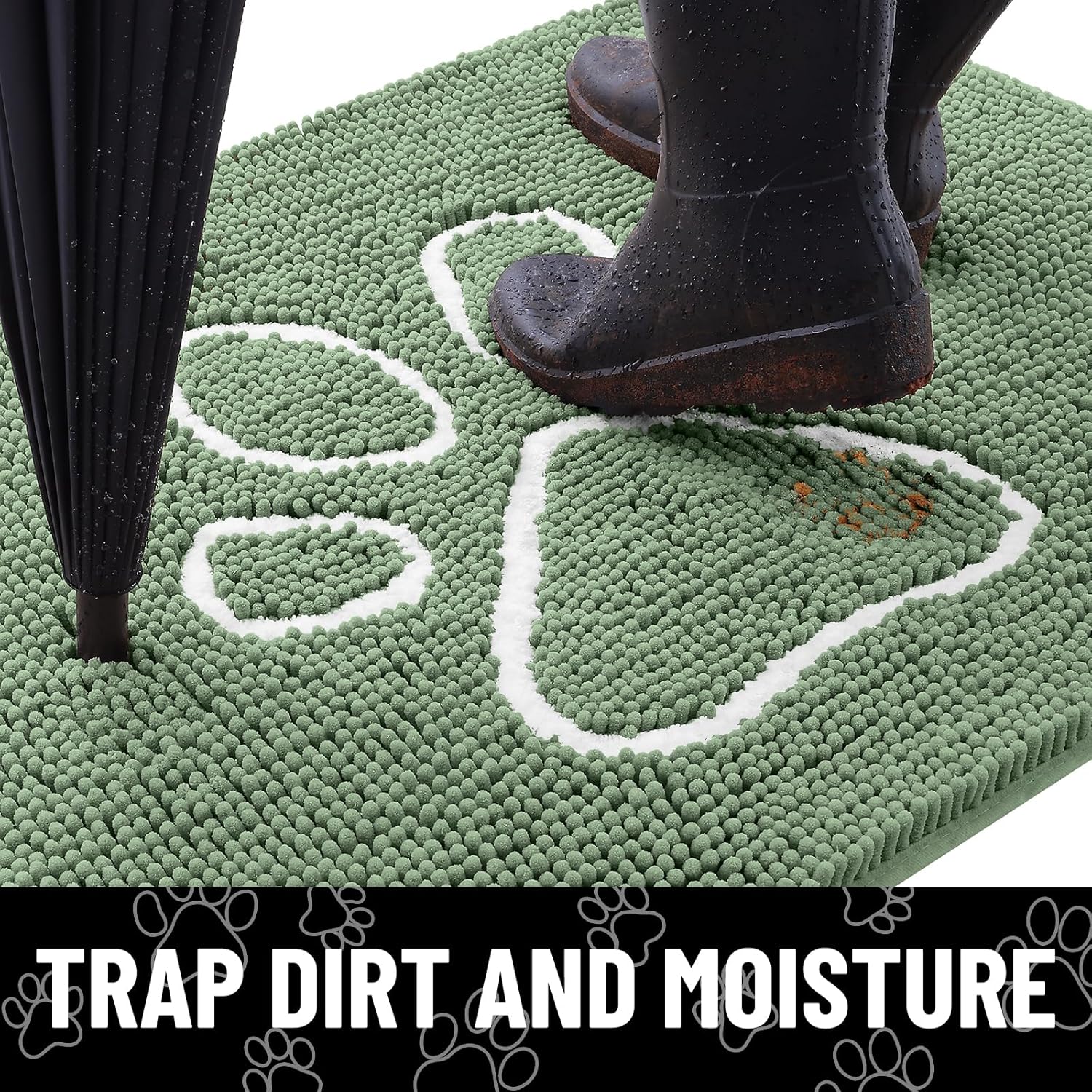 Smiry Dog Door Mat for Muddy Paws, Absorbent Dirt Trapper Non Slip Quick Dry Washable Chenille Mat for Mud Dogs, Entry Rug for Indoor and Outdoor (30x20 Inches, Olive Green and White)