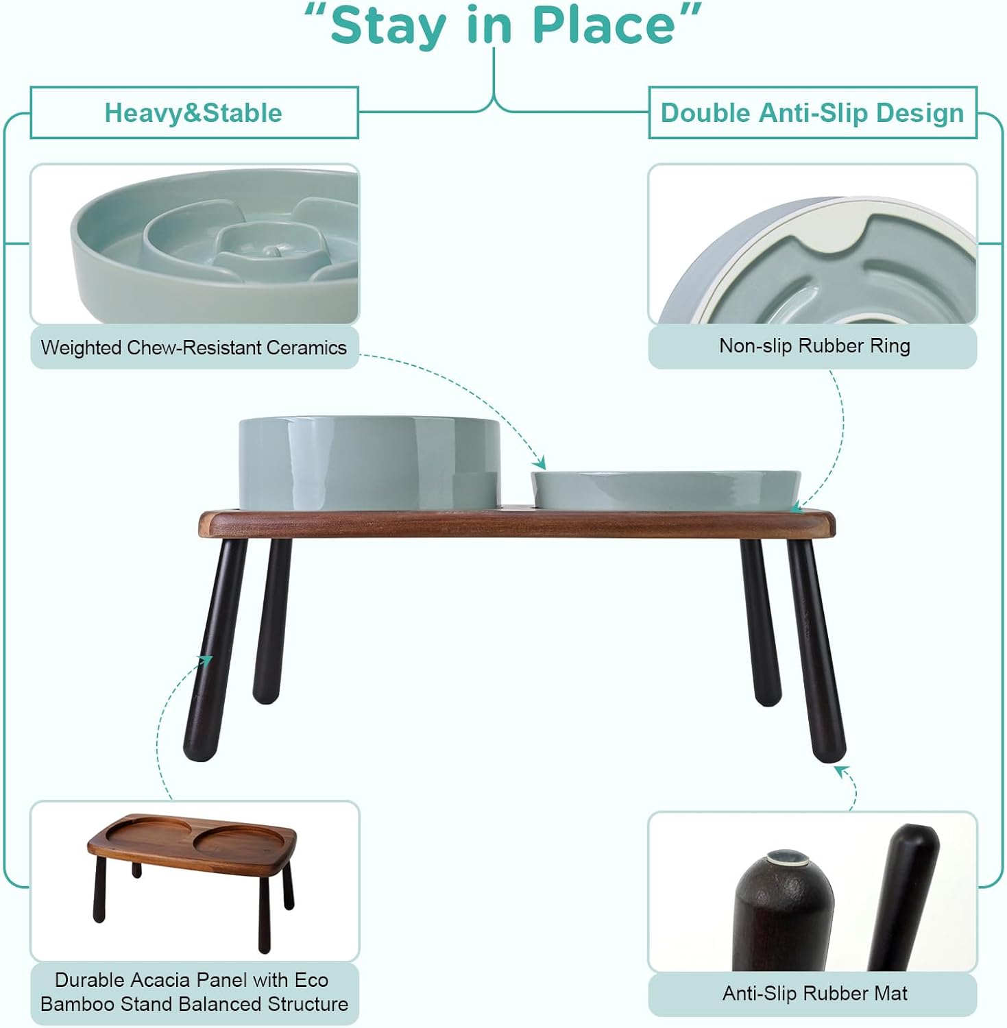 - Stable, Tip‑Resistant Design – A solid acacia wooden panel eco bamboo legs stand with Chew‑Resistant Heavyweight Ceramic, wide stance, and slip‑proof silicone pads join forces to create raised dog bowls that STAY IN PLACE on tile, wood, or laminate. Fewer spills mean cleaner floors and no accidental gouges or scratches or noisy
