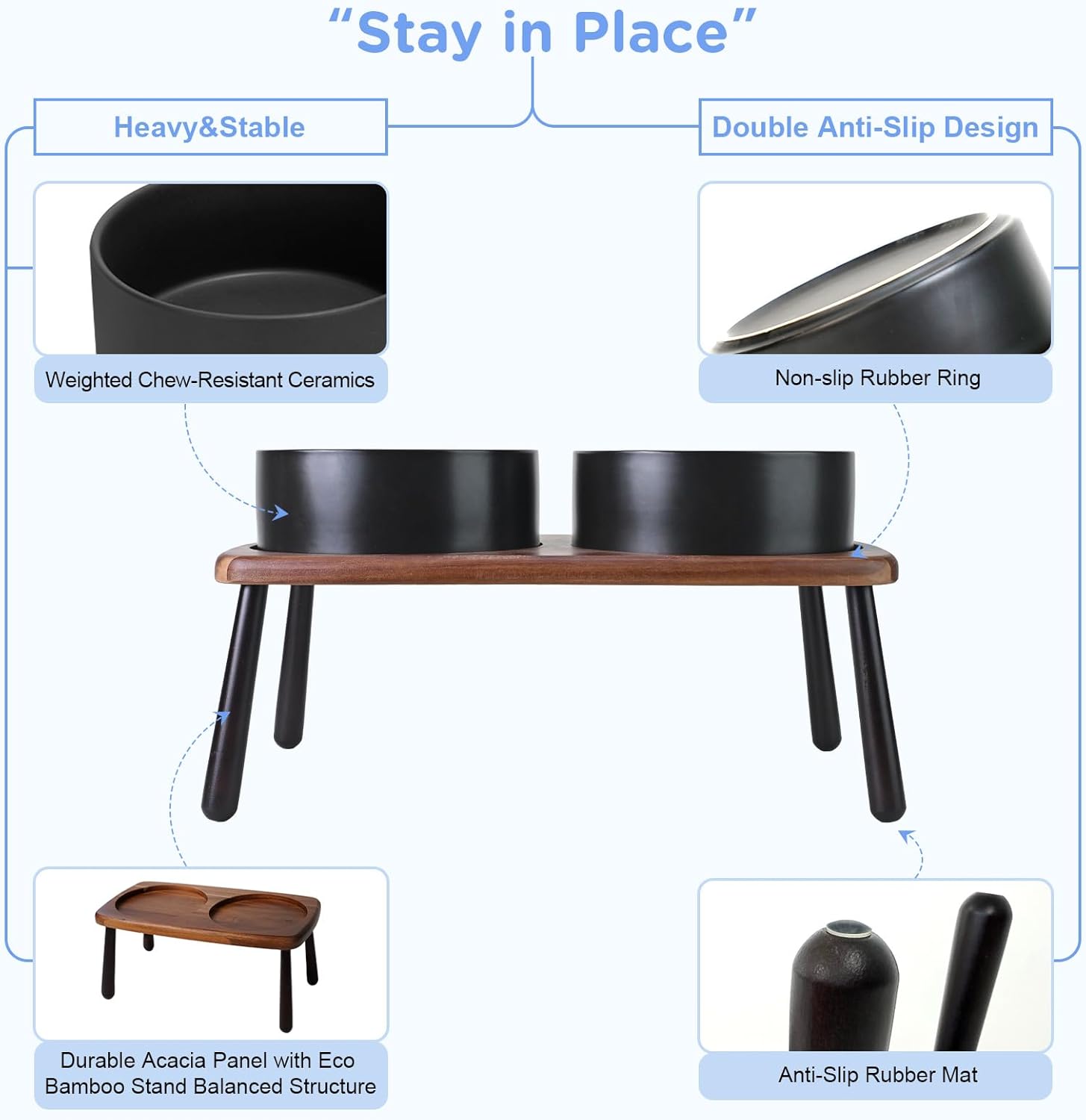 - Stable, Tip‑Resistant Design – A solid acacia wooden panel eco bamboo legs stand with Chew‑Resistant Heavyweight Ceramic, wide stance, and slip‑proof silicone pads join forces to create raised dog bowls that STAY IN PLACE on tile, wood, or laminate. Fewer spills mean cleaner floors and no accidental gouges or scratches or noisy