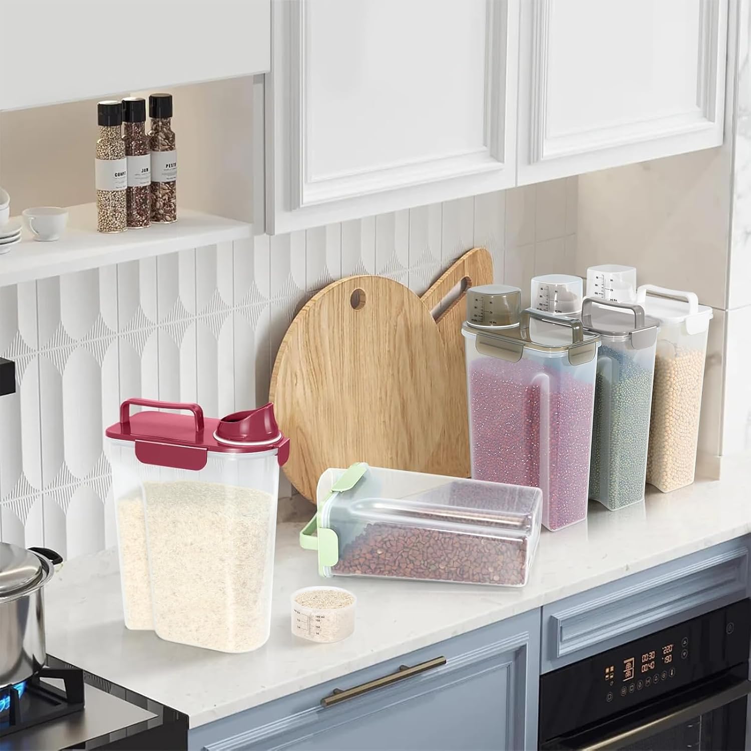 - MULTI-PURPOSE STORAGE : Our pet food container is suitable for storing dog food、cat food、bird seed、fish food、rice、 dry food、cereals、oats、flour and other large and small grains, as well as washing powder used at home. It is also a good choice.