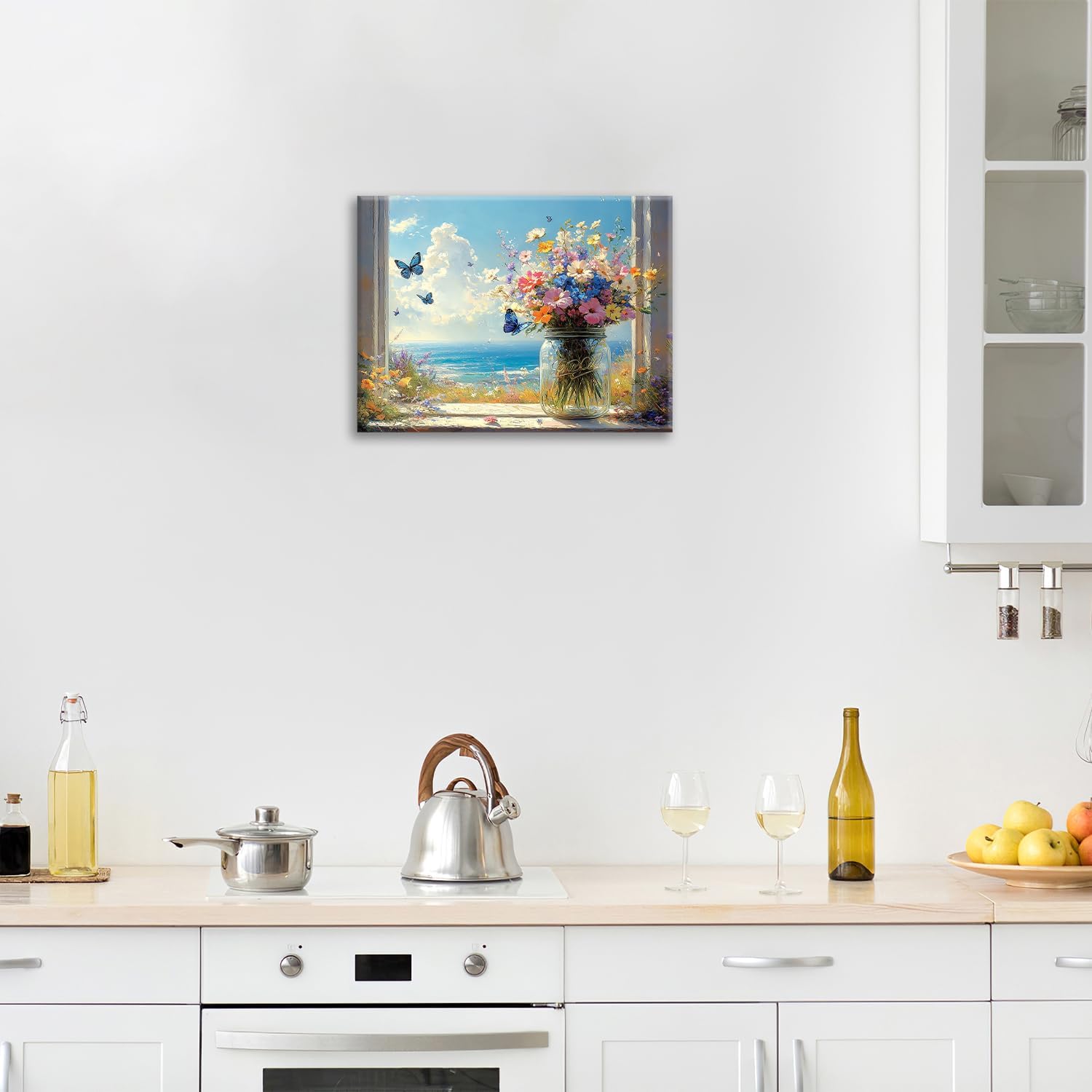Beach Floral Bathroom Pictures Wall Art, Colorful Flower Bathroom Wall Decor, Coastal Ocean Framed Painting Canvas Artwork for Bedroom Living Room Decorations 20"L x 16"W