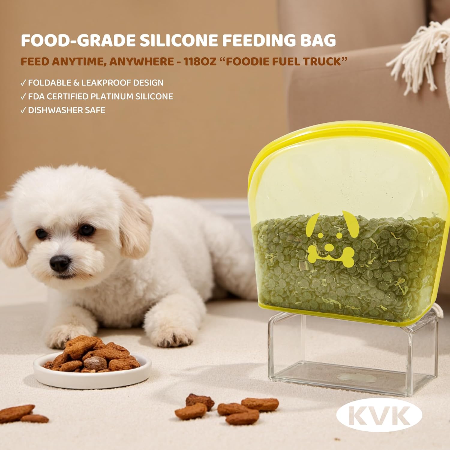 KVK Extra Extra Large Silicone Dog Food Mat 39.4×43.3in and 128oz Silicone Bag Set, Super Size Waterproof Pet Feeding Mat & Container, Non-Slip, Chew-Resistant Floor Protection (Beige&Yellow)