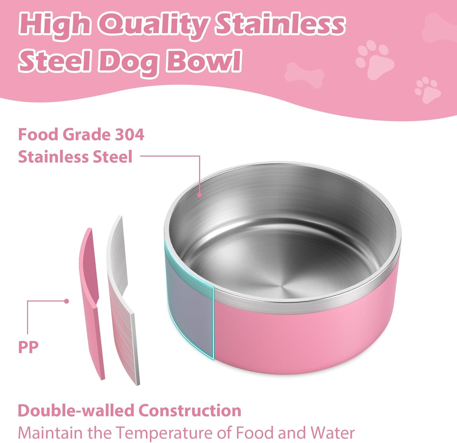 LIANLAI Dog Bowls, Rust-Resistant Stainless Steel Dog Bowls, Non-Slip Double-Walled Pet Dishes, Dishwasher Safe (Pink,40 oz)