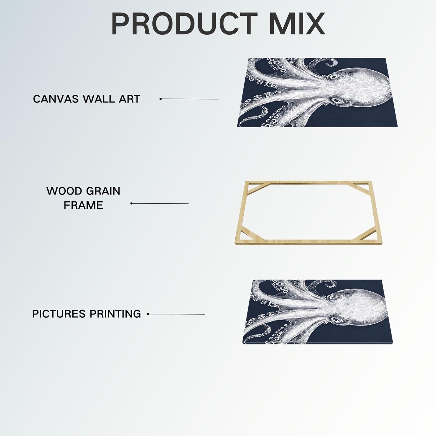 - Octopus Canvas Art: The white canvas art overall picture content of this theme is presented in blue color bars, connecting with the bedroom and bathroom environments, bringing you a relaxed and pleasant feeling.It is lnspiring for those who appreciate blue wall art art of timeless aesthetics