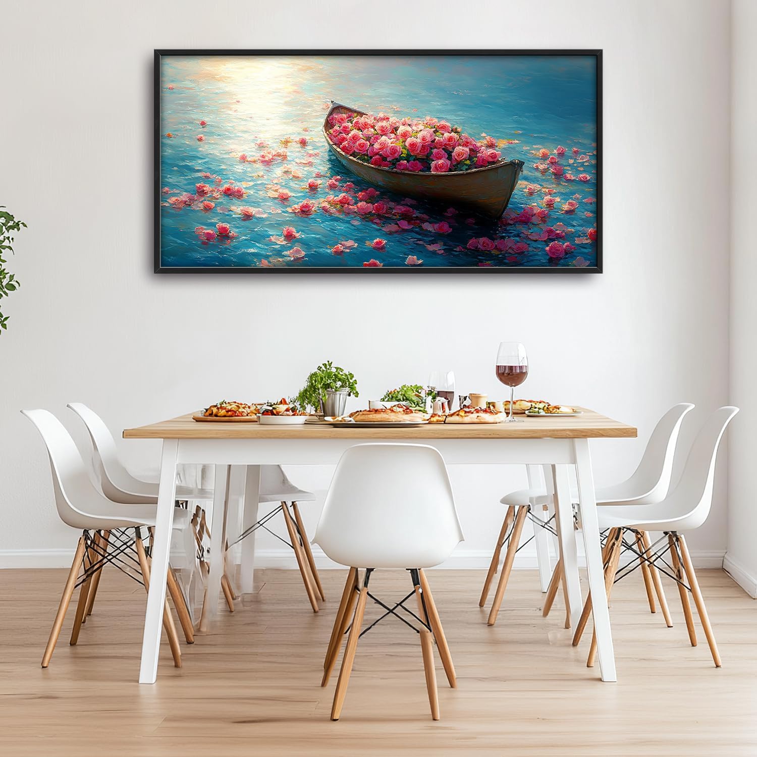 Large Lake Floral Landscape Wall Art for Living Room, Nature Boat Flower Canvas Oversized Wall Decor, Rose Scenery Framed Pictures Painting Print Artwork for Bedroom Office 60L" x 30W"
