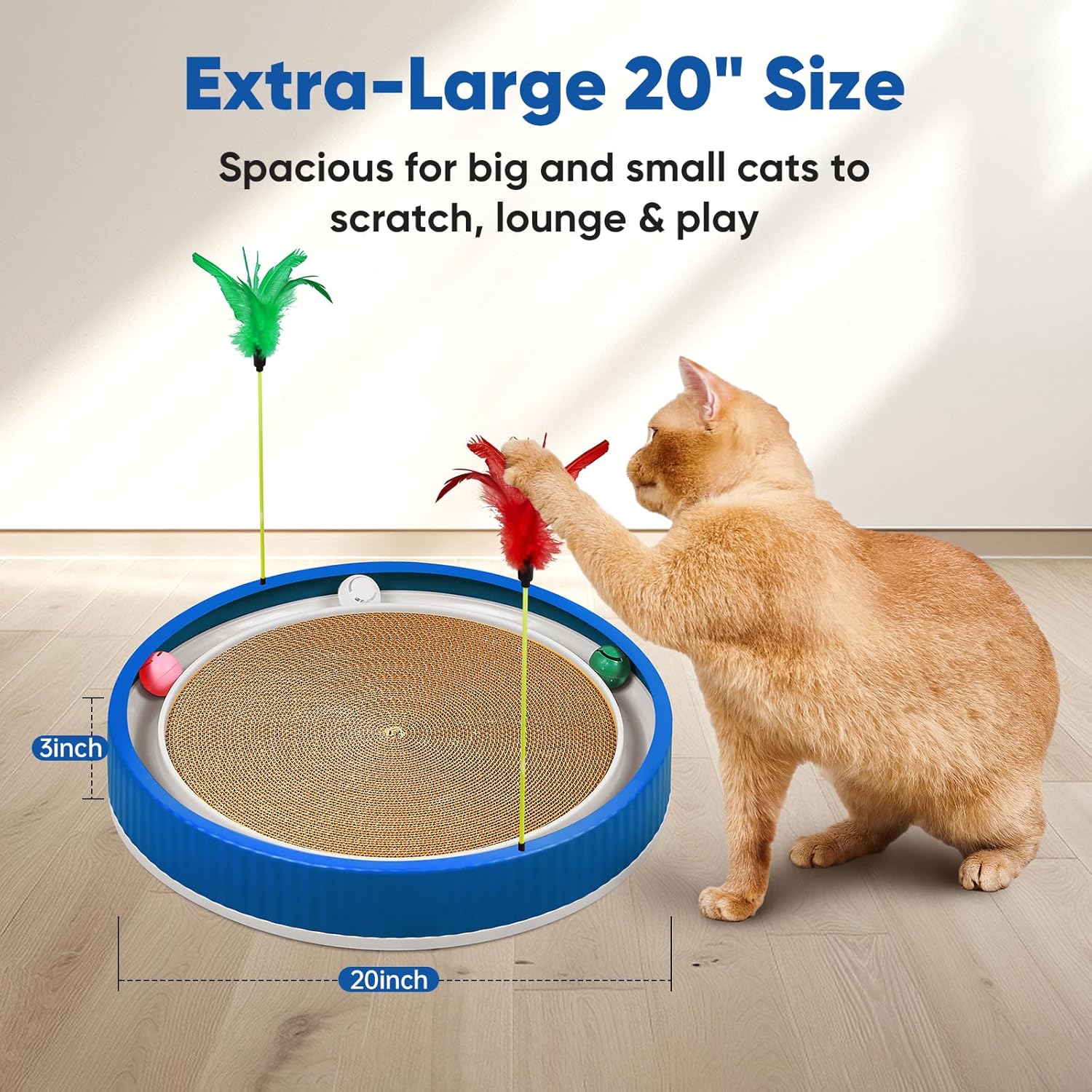 20-Inch Round Cat Scratcher with Ball Track – 3-in-1 Cardboard Scratching Pad with Feather Toy & Non-Slip Base – Interactive Cat Toy for Indoor Cats, Kittens & Large Cats (Blue)