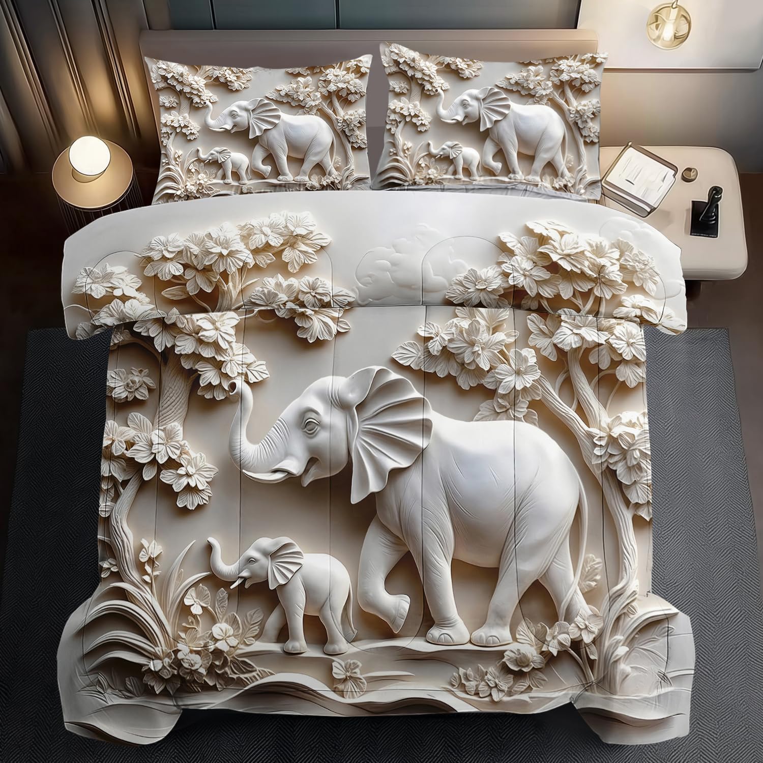 Elephant Comforter Set Queen Adult, White Animal Bedding Set Queen for Man, Cute Animal Comforter for Kids,Elephant Quilt Pattern White Bedroom Decor Womens, Relief Bedding