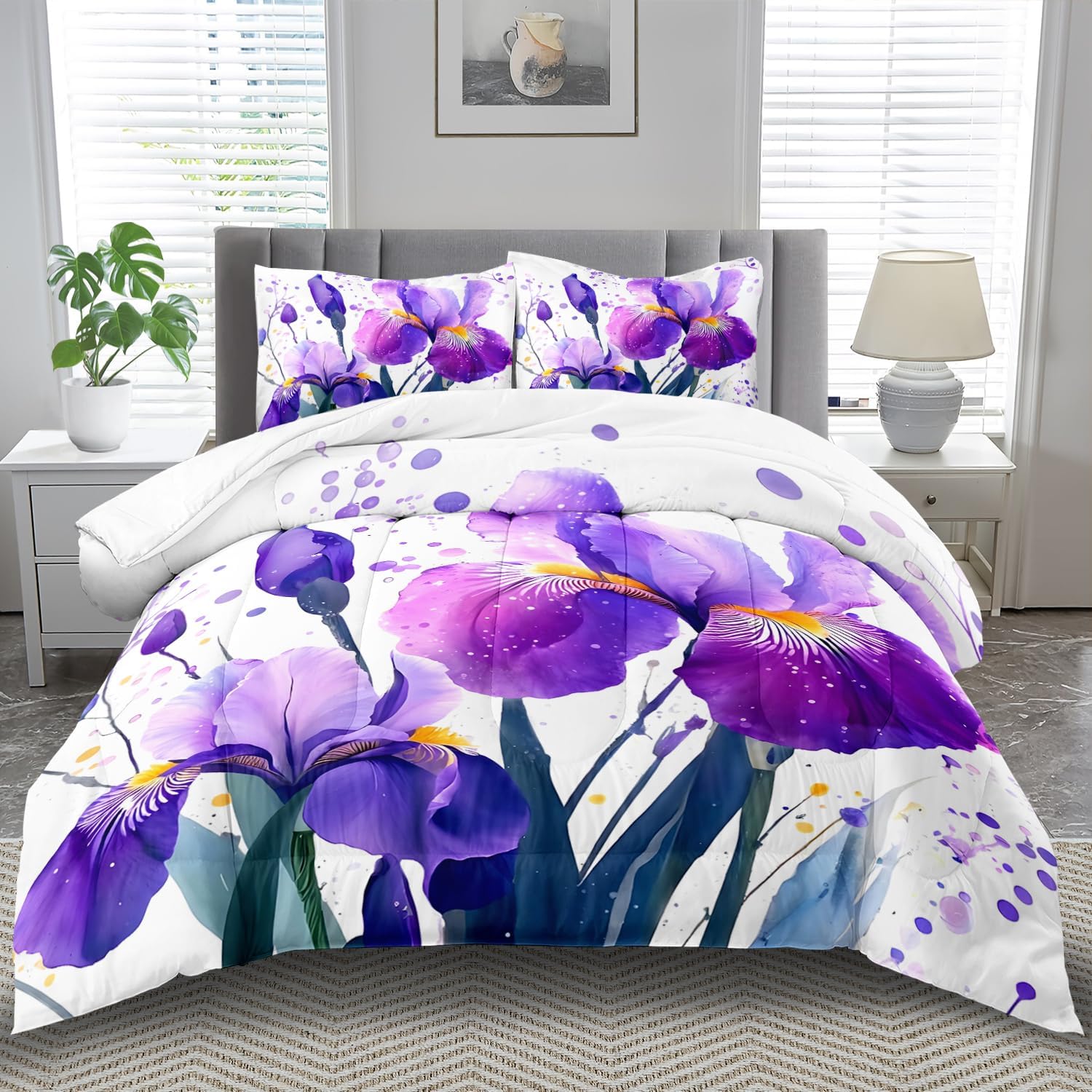- Queen Size Floral Iris Comforter Set :This bedding set includes 1 comforter(67" x 85") and 2 pillowcases(20”x30”). In order to facilitate transportation, the quilt is made of vacuum compression technology. It will be slightly wrinkled when taken apart, but it will quickly regain its fluffiness if you gently beat it.