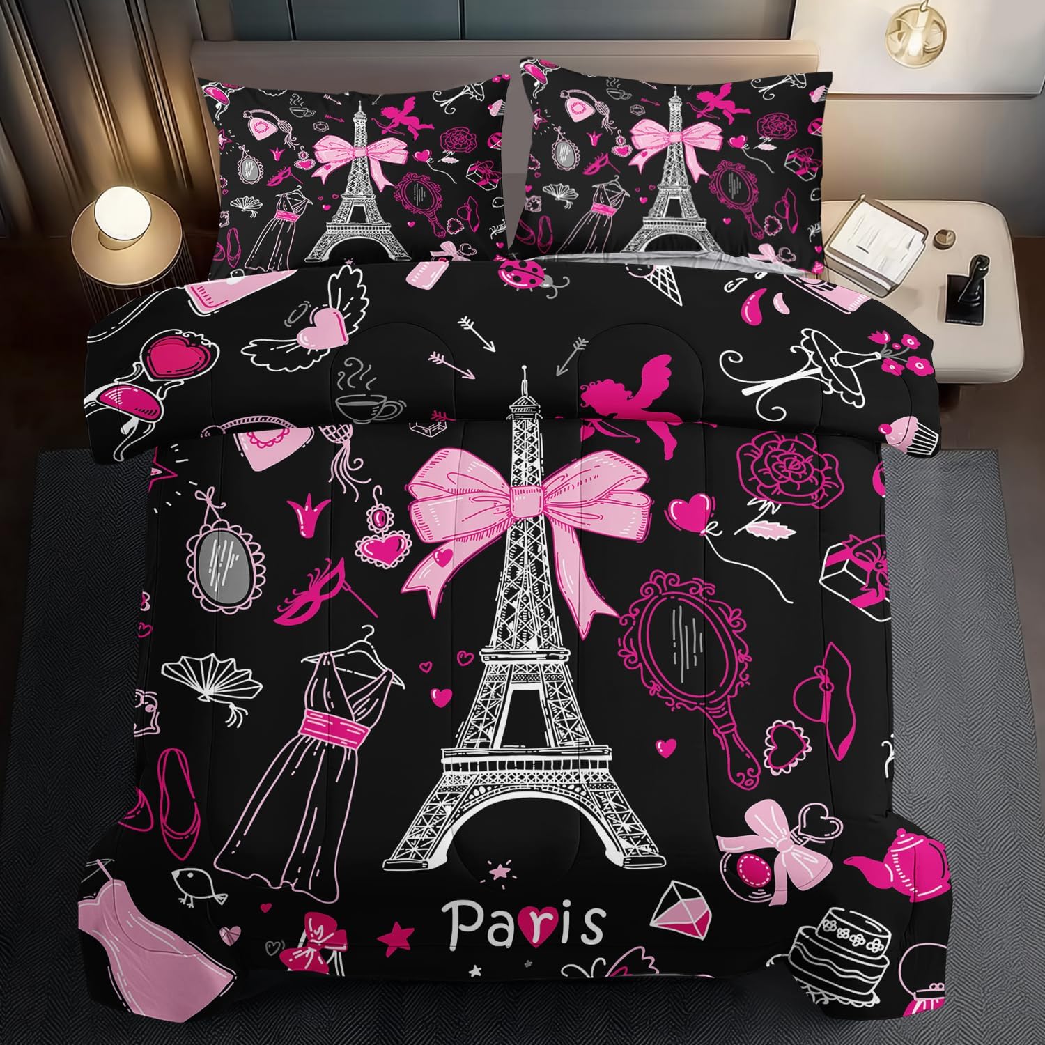 Eiffel Tower Comforter Set Full Size,Eiffel Tower Bedding Set for Girls, Pink and Black Paris Themed Comforter Bedroom Decor,Paris Quilt French Style Romantic Bedding