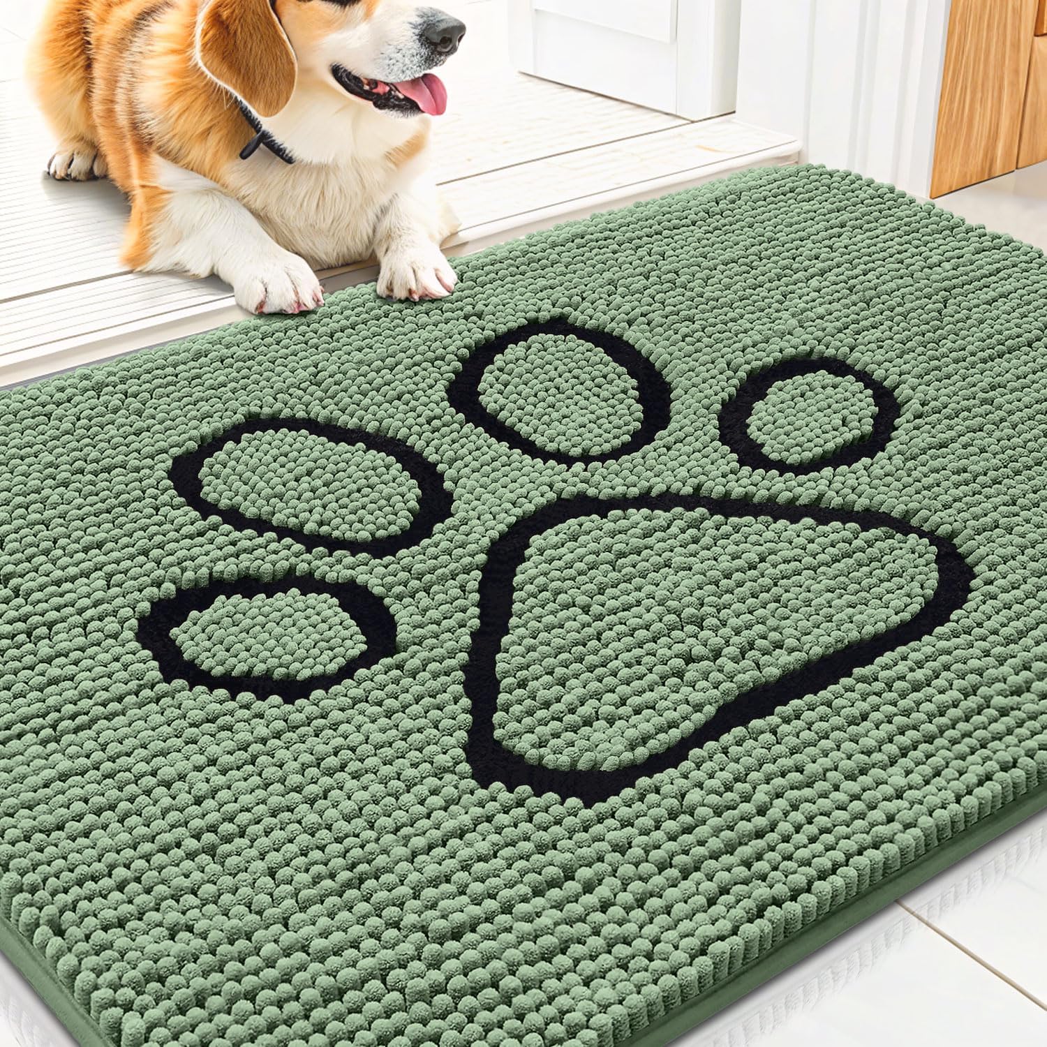 Smiry Dog Door Mat for Muddy Paws, Absorbent Dirt Trapper Non Slip Quick Dry Washable Chenille Mat for Mud Dogs, Entry Rug for Indoor and Outdoor (30x20 Inches, Olive Green and Black)