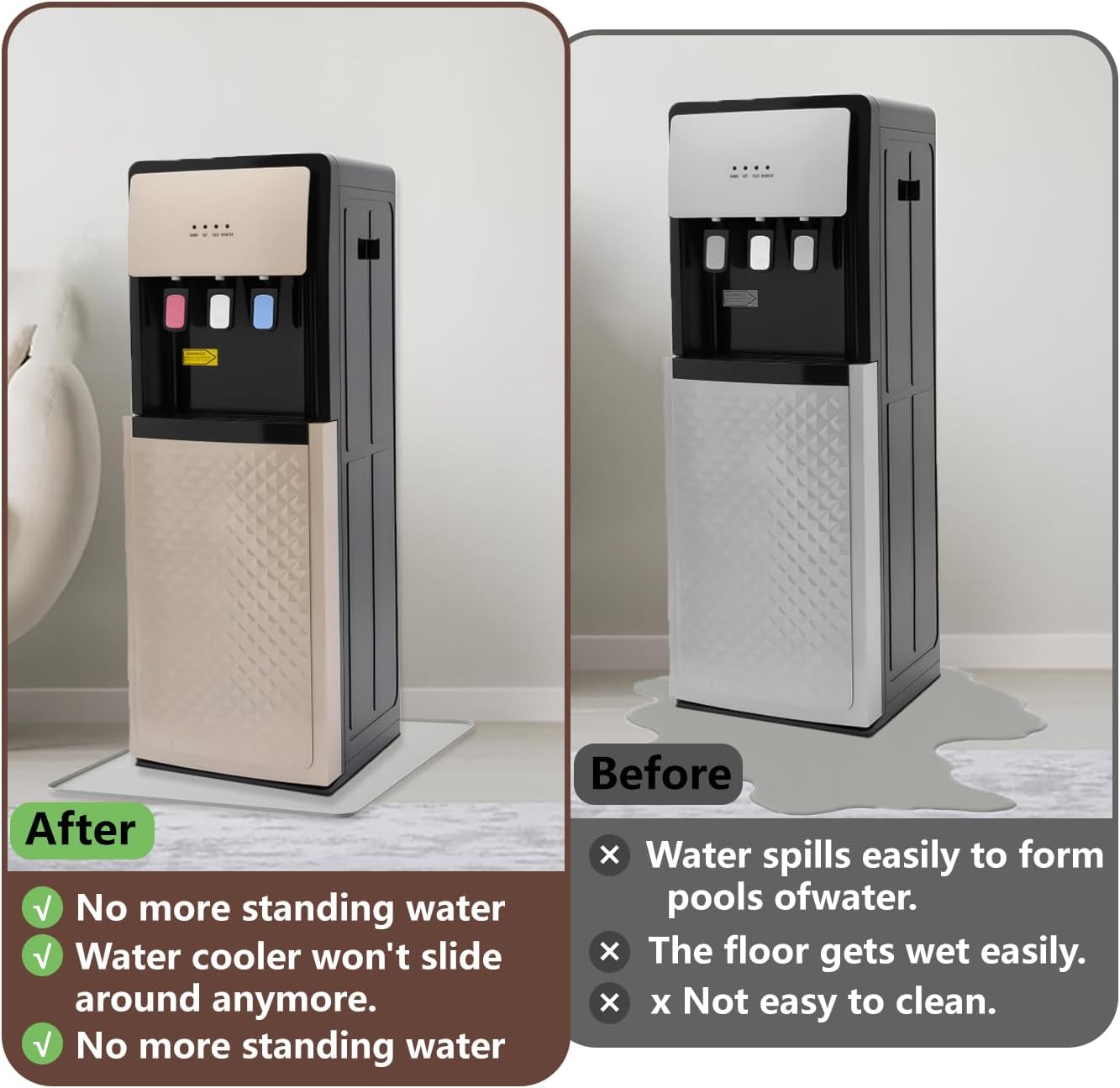 - 【Anti-slip Design】The back layer of the water cooler dispenser mat is anti-slip and waterproof enough. The refrigerator mat not only prevents water from flowing on the floor, but also prevents the mat from moving while also reducing vibration and noise, making it highly practical