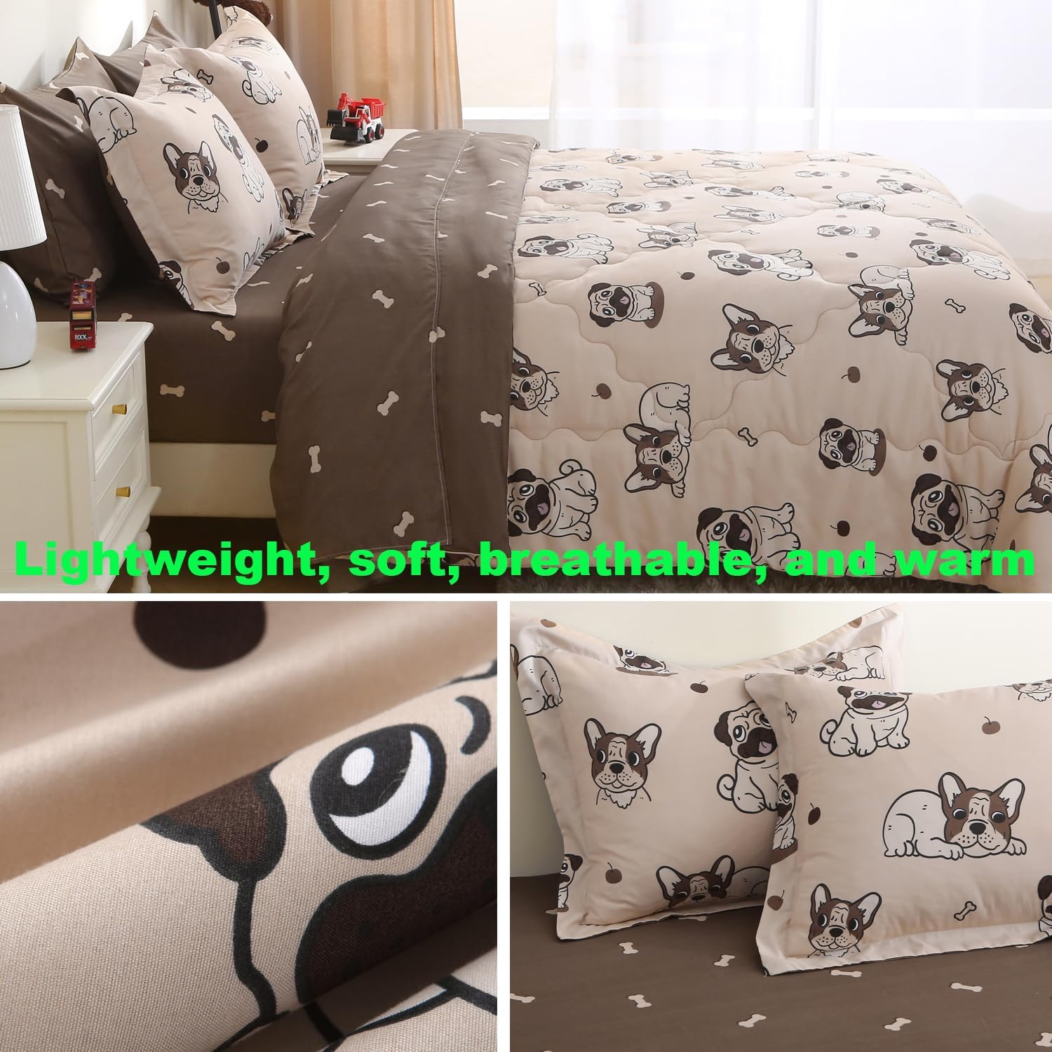 - 7 Piece Kids Comforter Set Included : 1 dog Twin comforter 68 inch x 86 inch + 2 standard pillowcases 20 inch x 26 inch - 1 twin size fitted sheet 39 inch x 75 inch - 1 twin size flat sheet 66 inch x 96 inch - 2 standard pillowcase 20 inch x 26 inch.